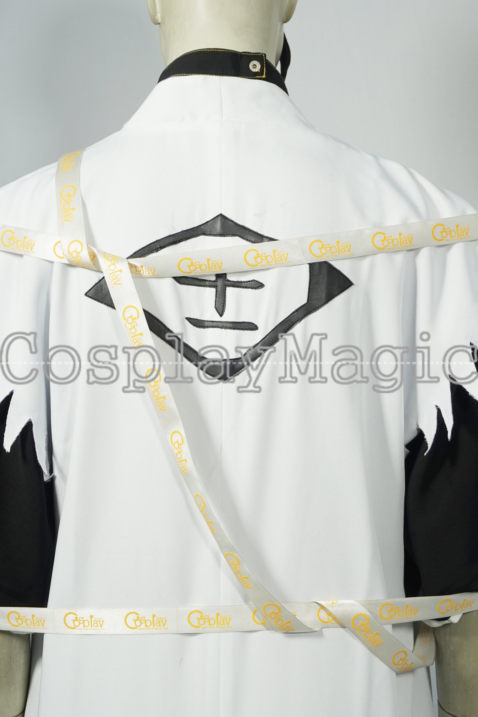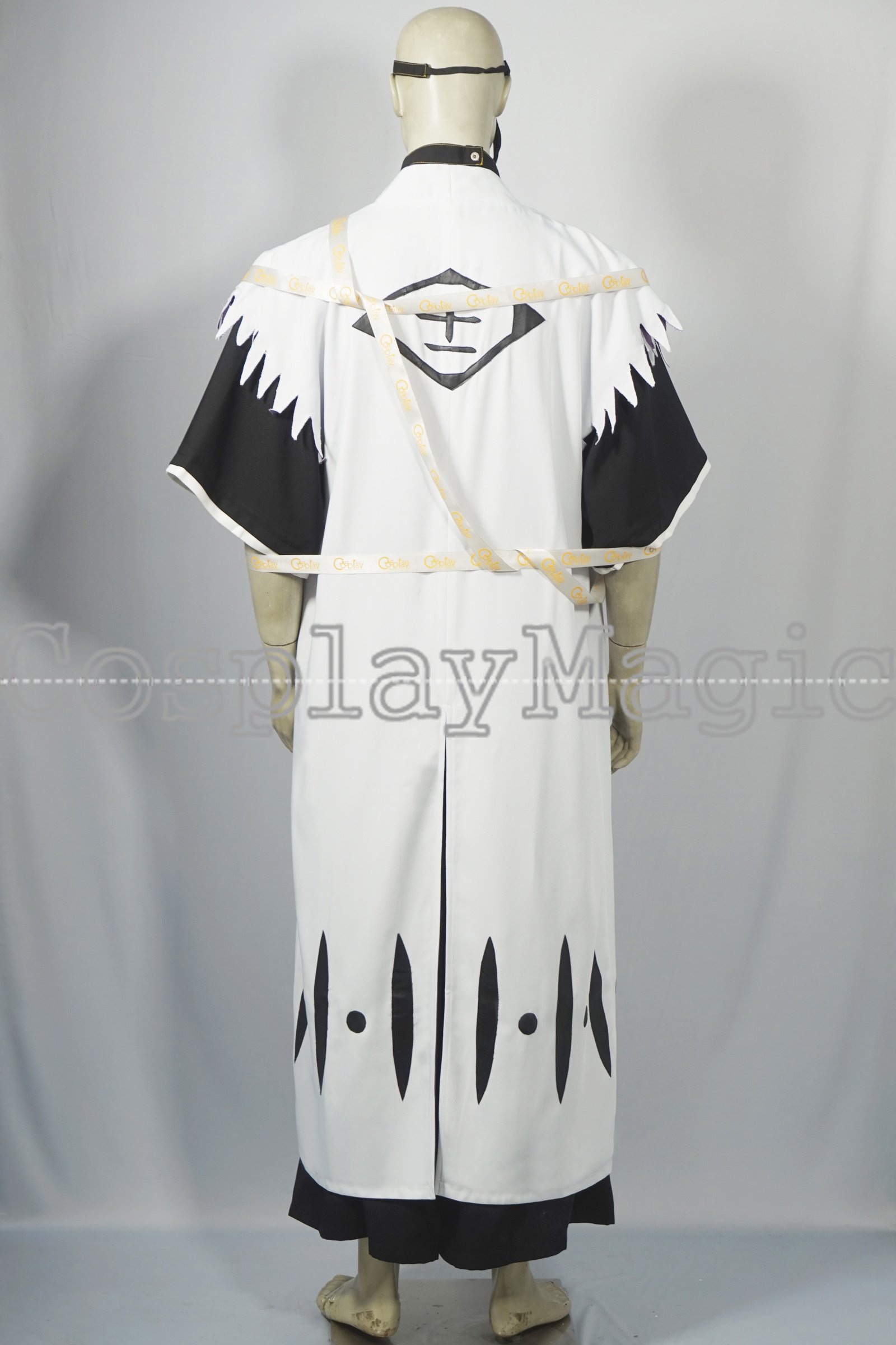 - White sleeveless ragged captain’s haori with 11th Division emblem on the back and alternating pattern along the bottom