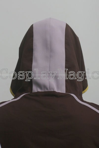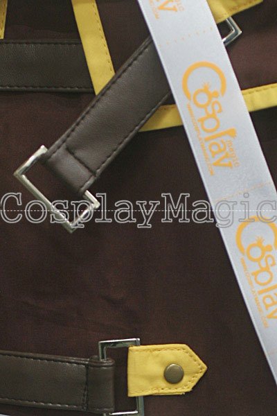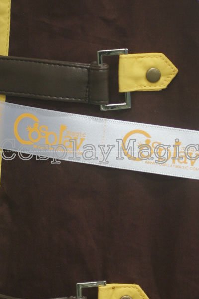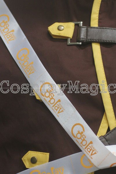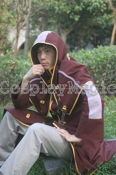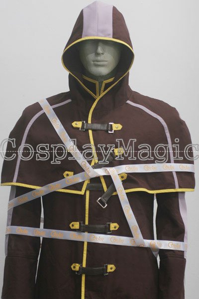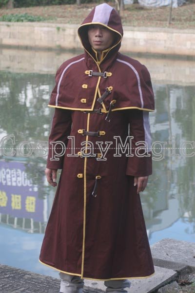 - Dark red high-collared coat with hooded mantle, yellow edges and black faux leather buckles