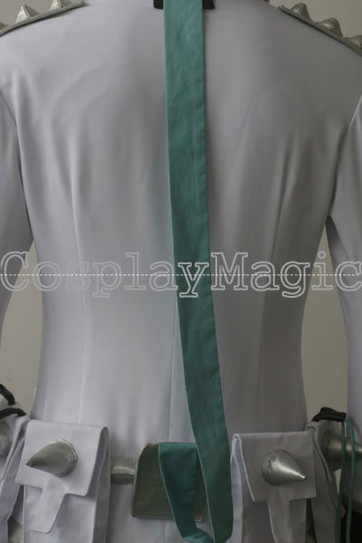 - High-collared white jacket, zip front