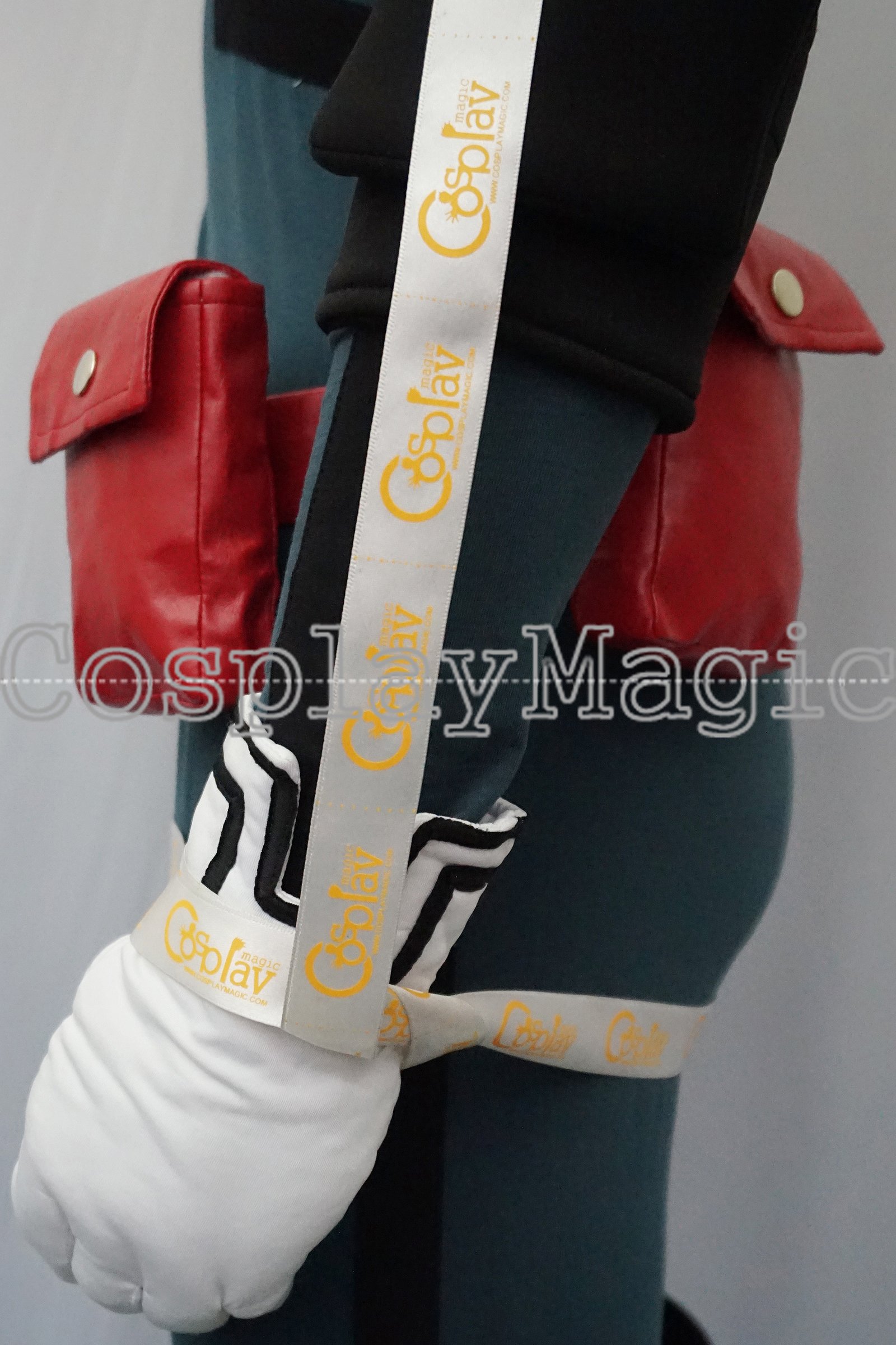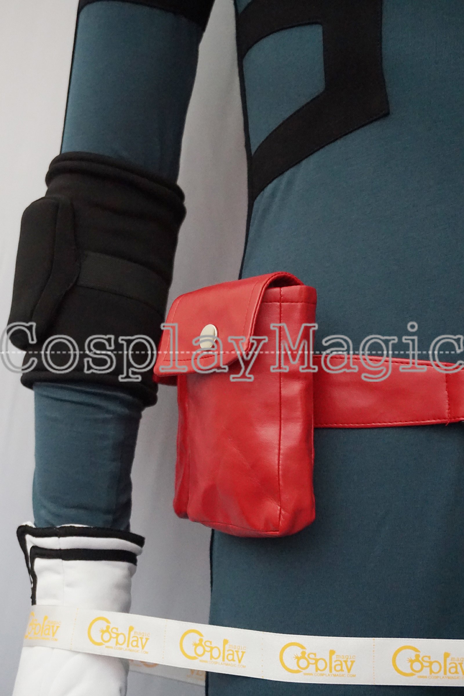 - Dark green jumpsuit with red faux leather belt and pouches