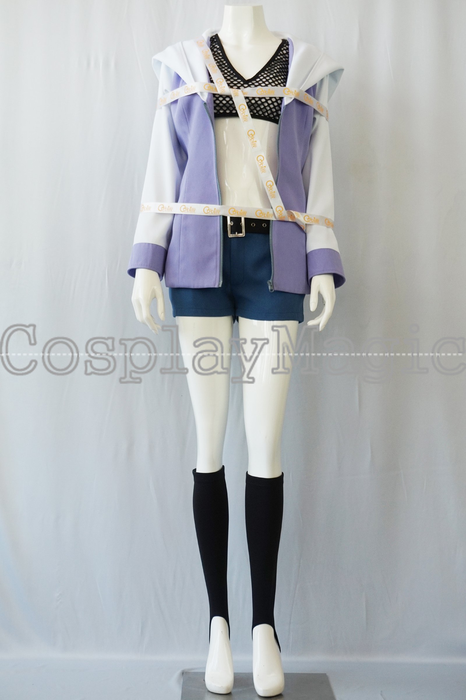 - Blue shorts with black belt