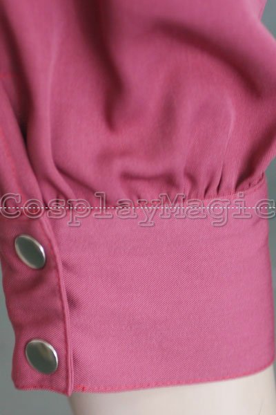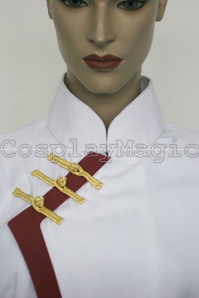 - Long-sleeved white blouse with red edges and yellow fastening buttons