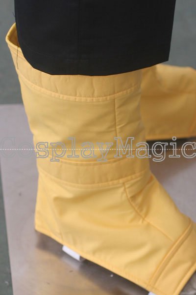 - Black bodysuit with yellow magatama markings around collar and yellow circle in the front