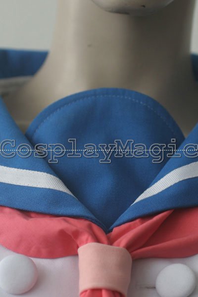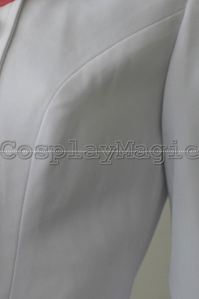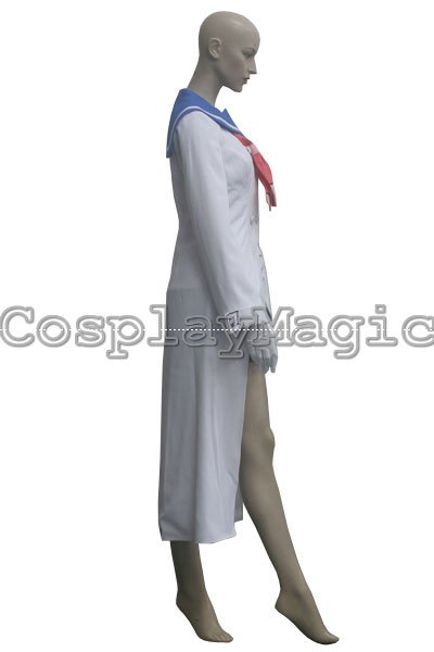 - White trench coat with blue sailor-style collar and red necktie