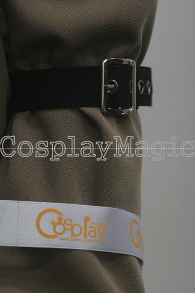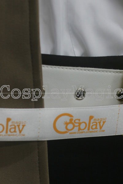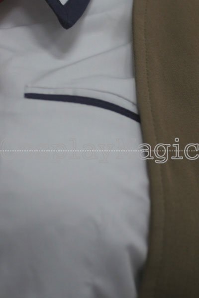 - Brown jacket with white and black hem and cuffs, buckles on arms