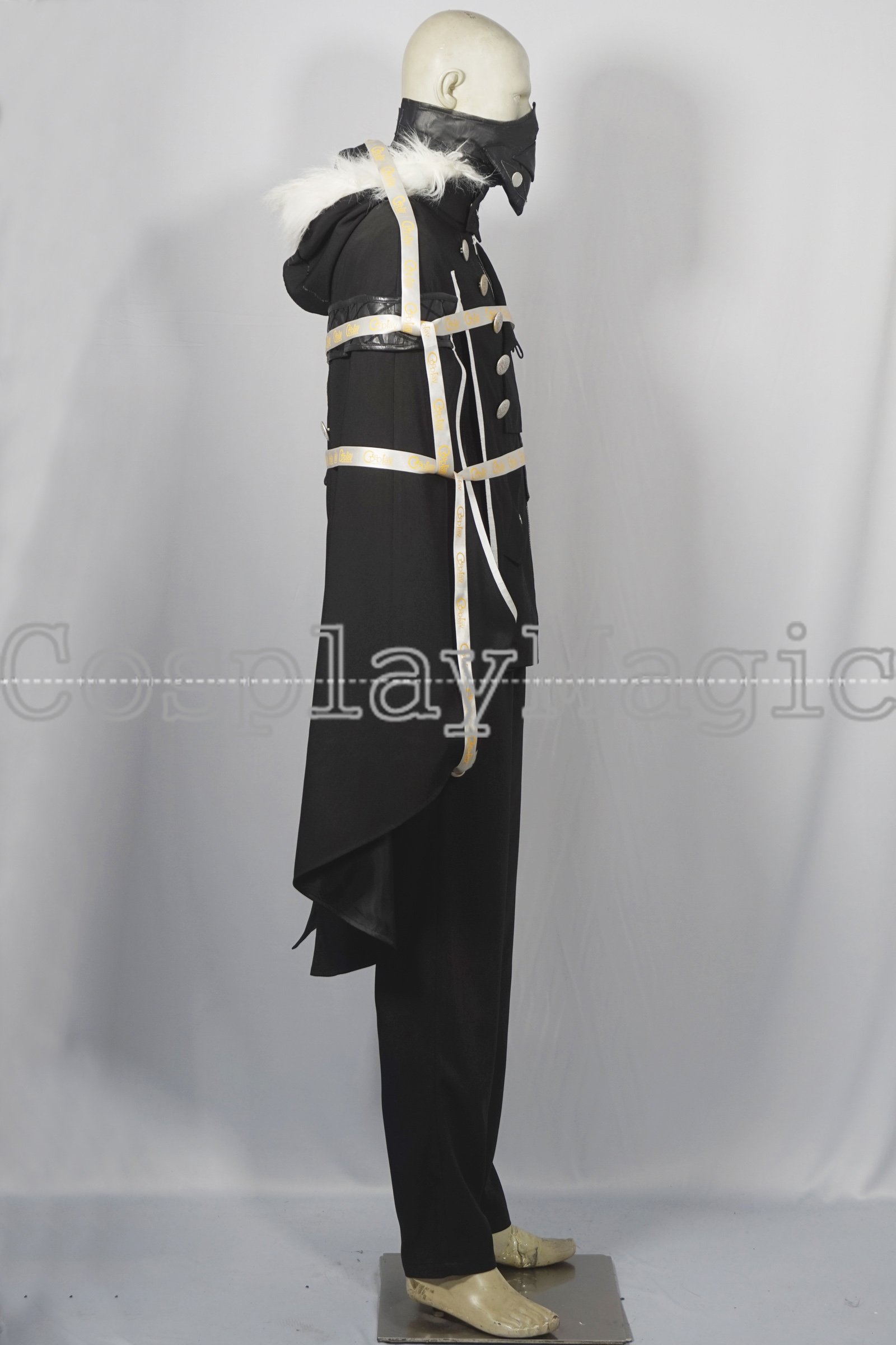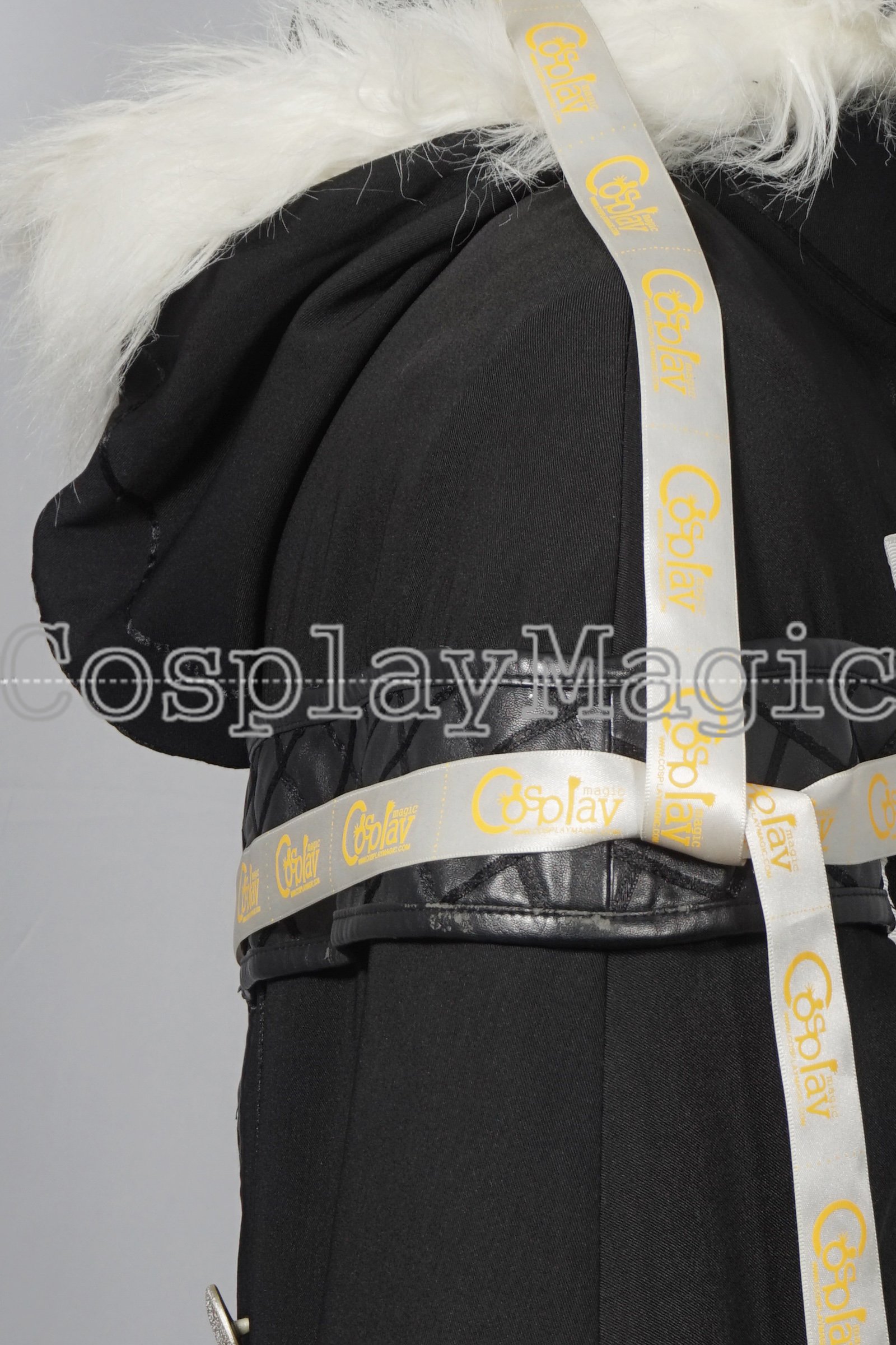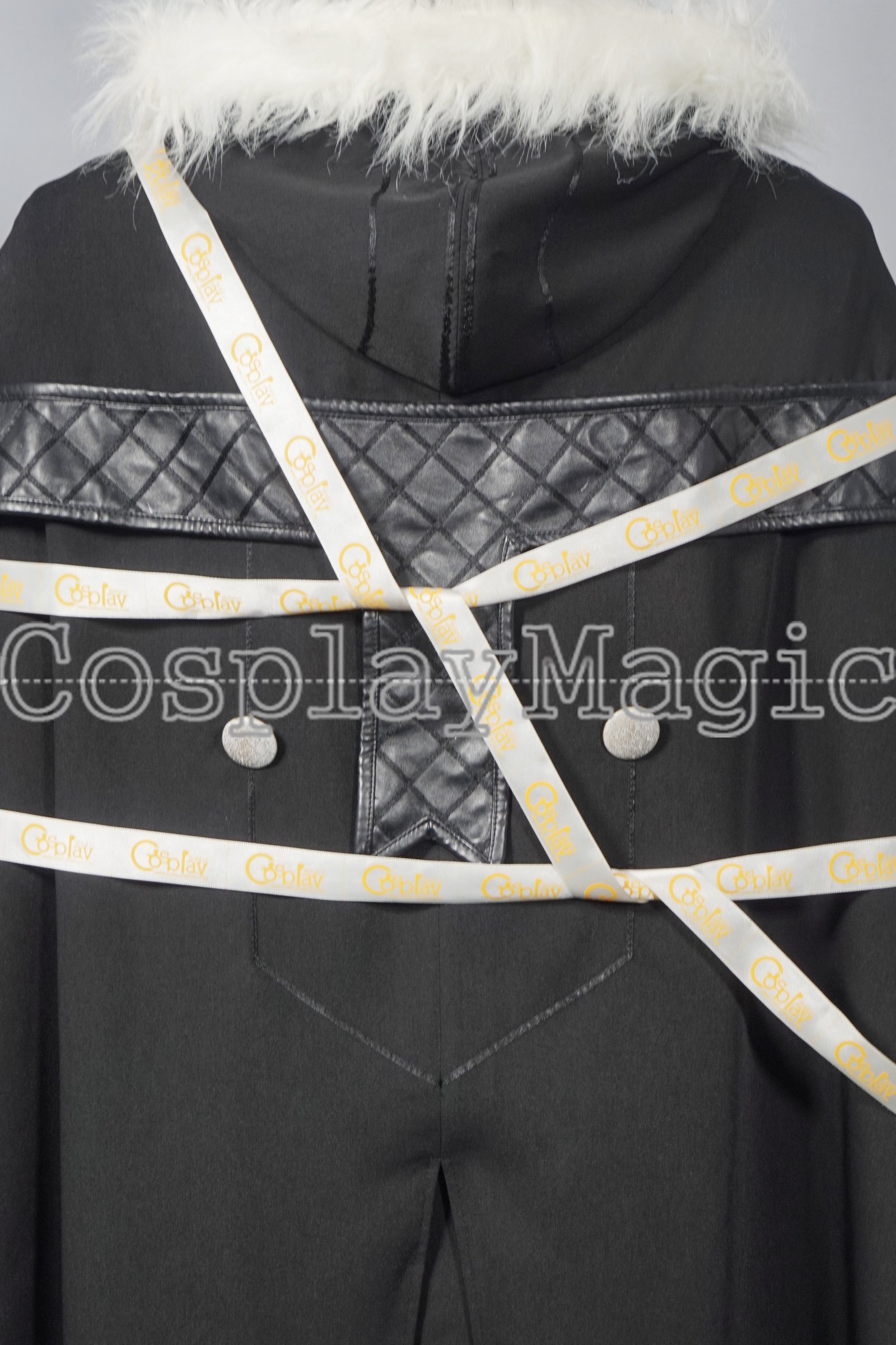 - Hooded black overcoat with white fur collar