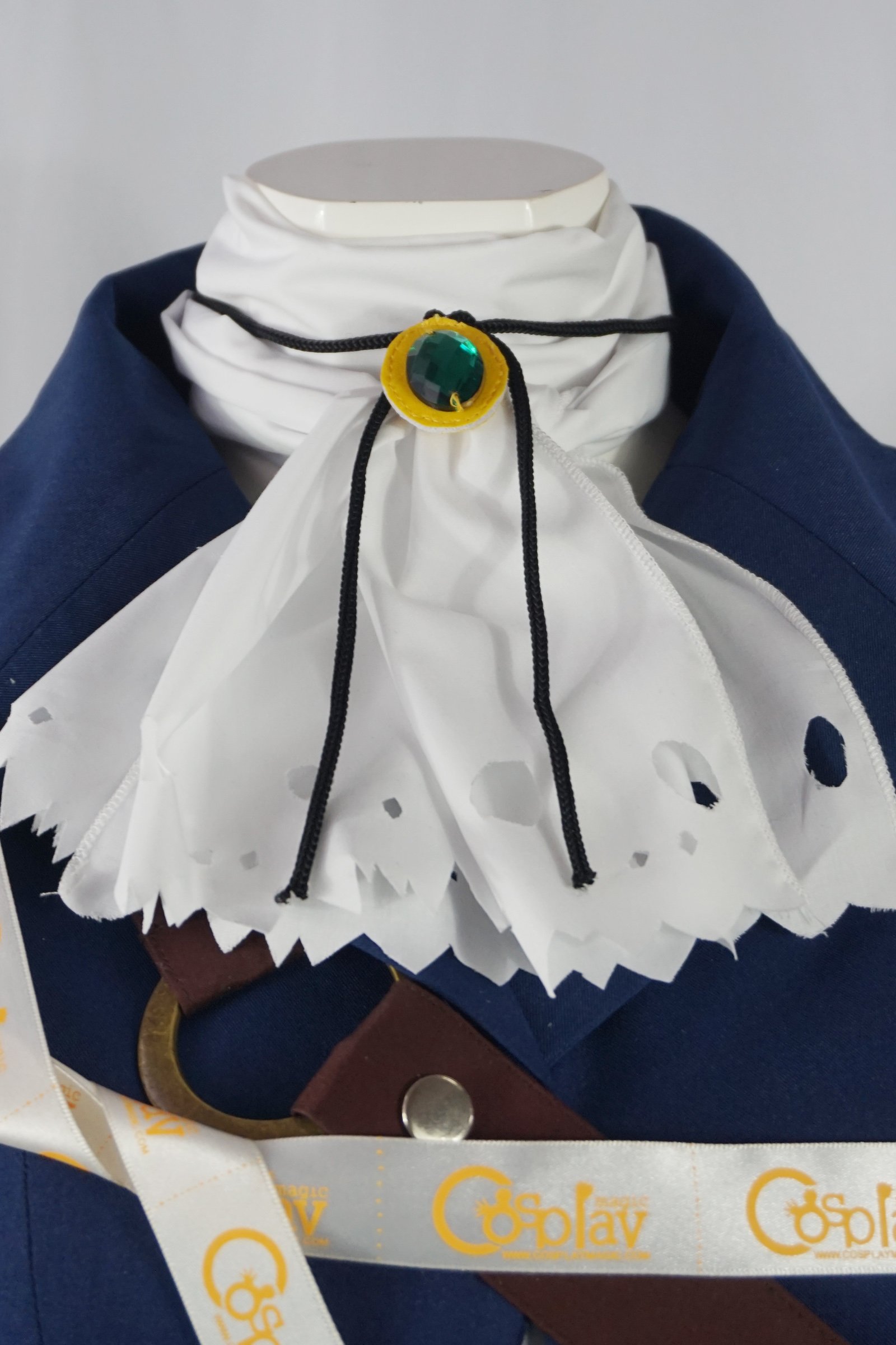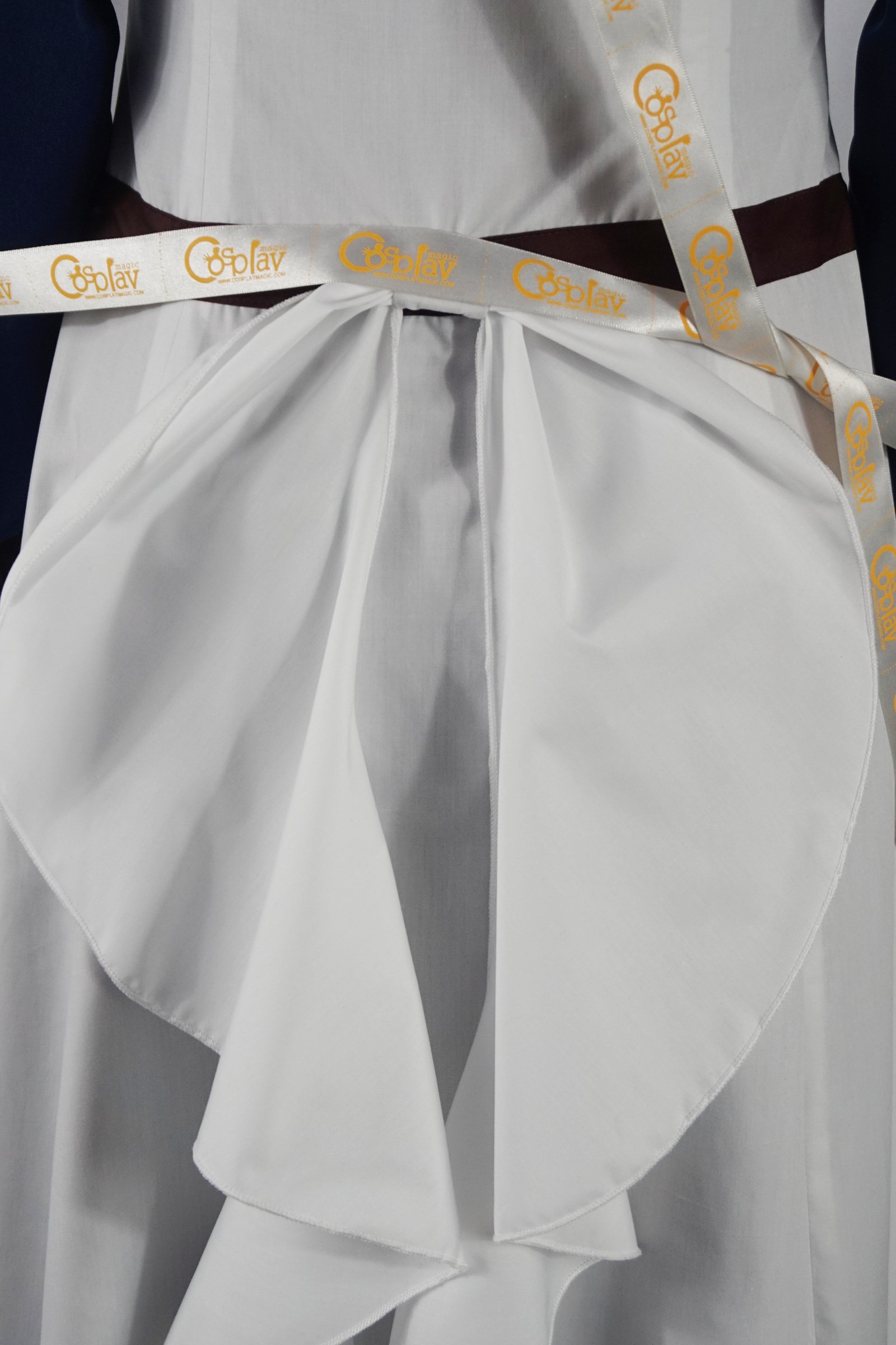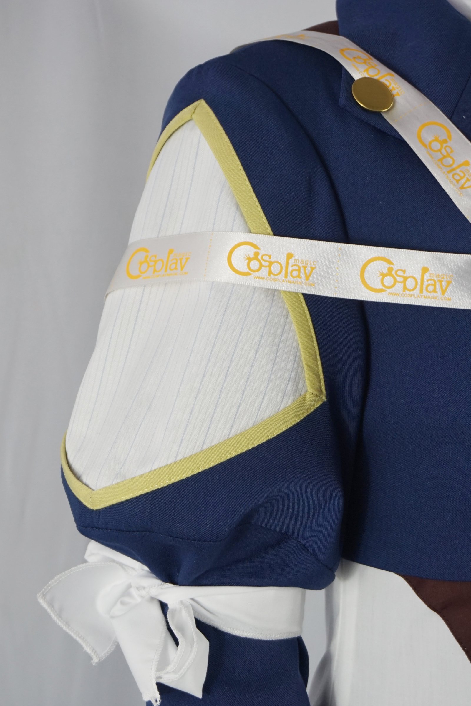 - Blue long-sleeved jacket with white ribbon-tie dress underneath