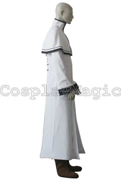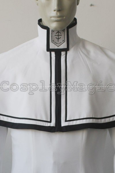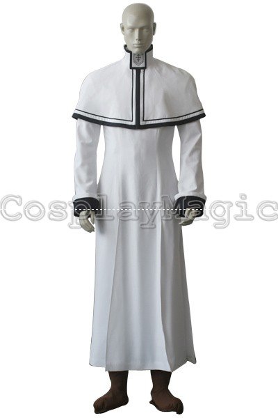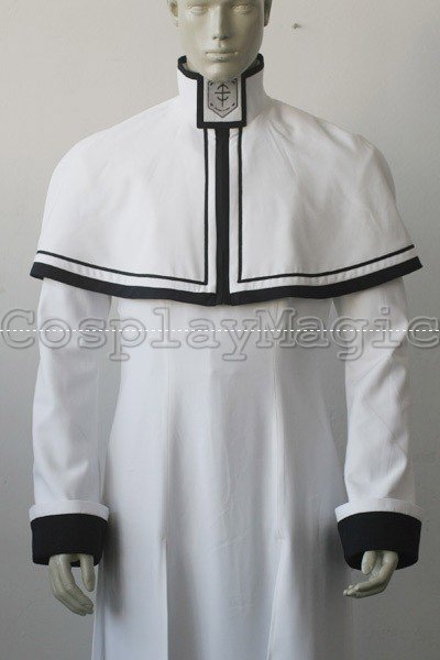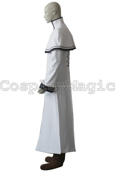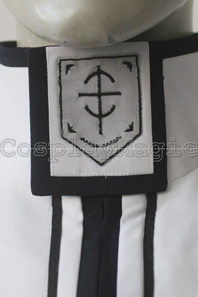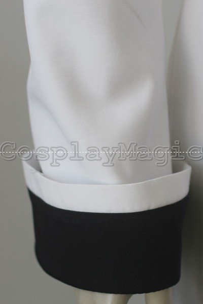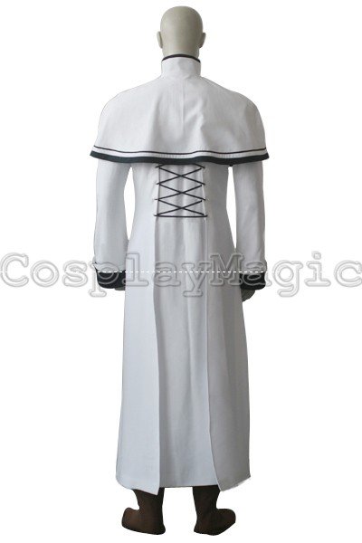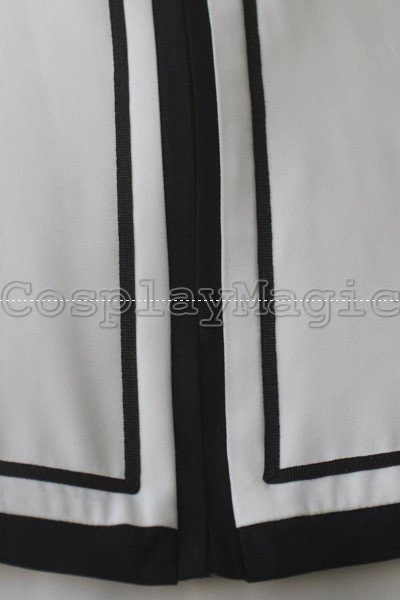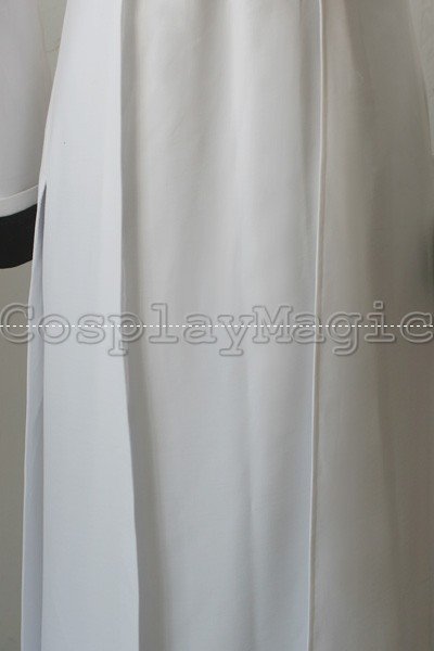 - White robe with black cuffs and edges, criss-cross stitching on the back