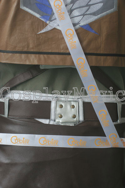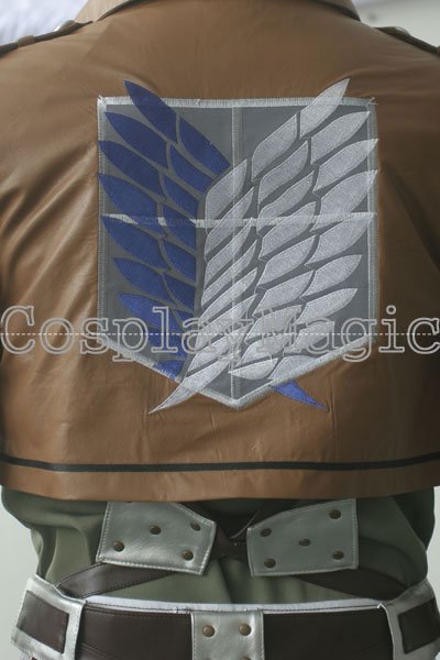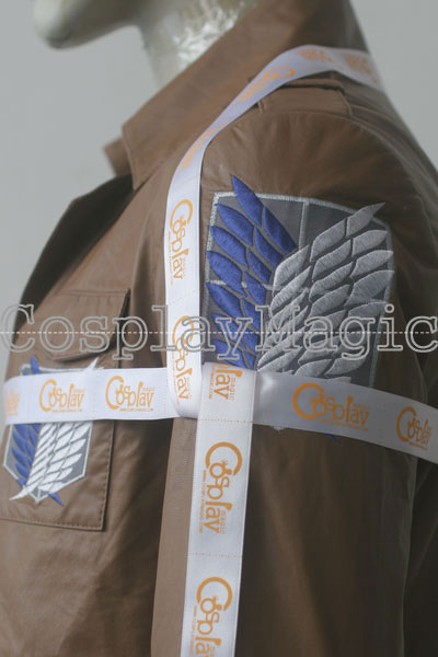 - Short, light-brown, faux leather jacket with the badge of the Survey Corps on both shoulders, on the front left pocket, and on the back