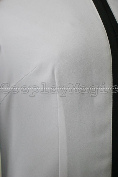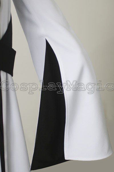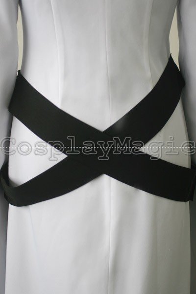 - Black belt criss-crossing around waist
