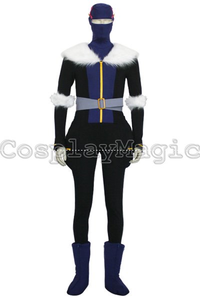 - Black jumpsuit with white faux fur collar, Gray shield on back
