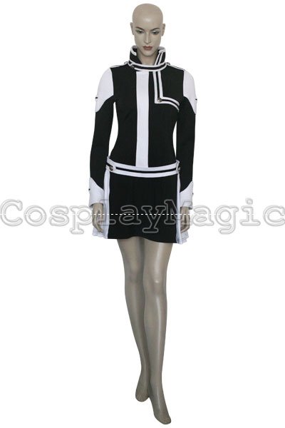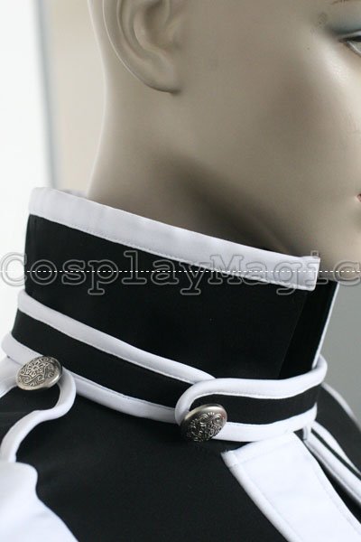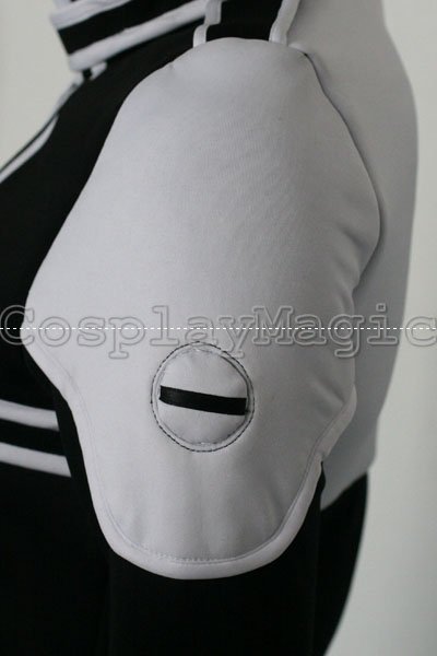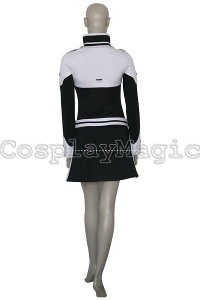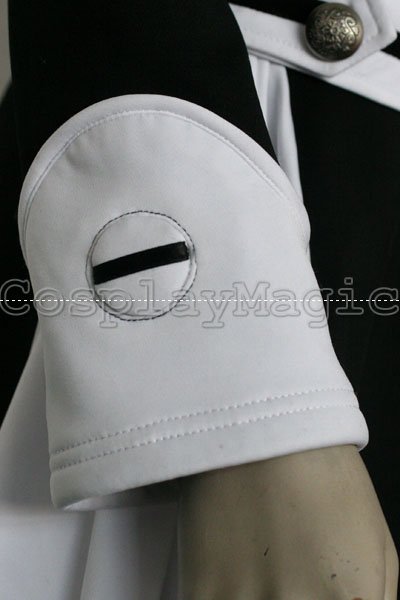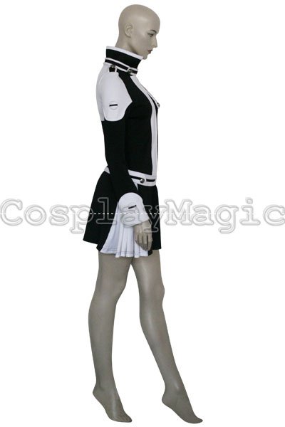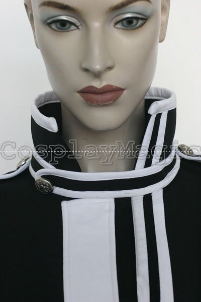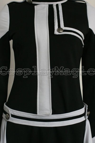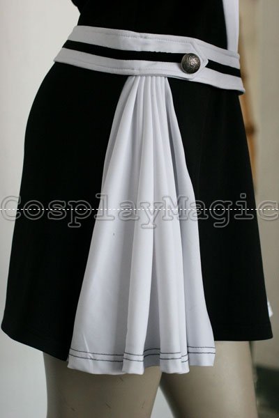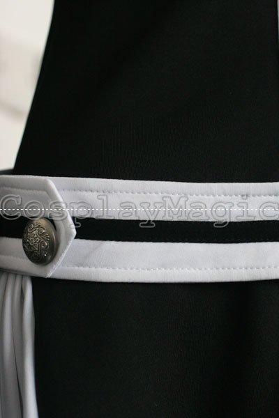 - Black dress with white shoulders and cuffs, white frills on the both sides