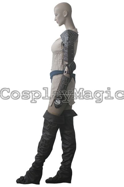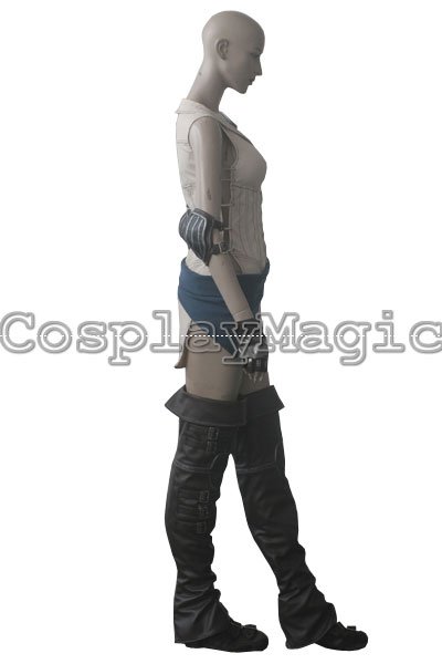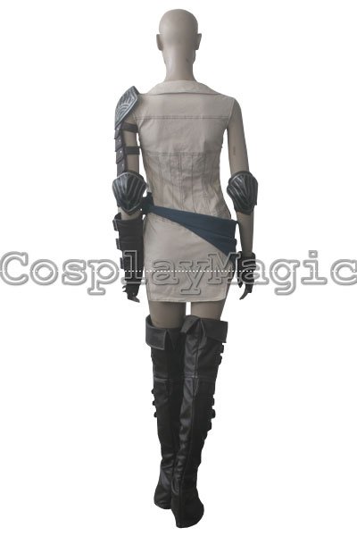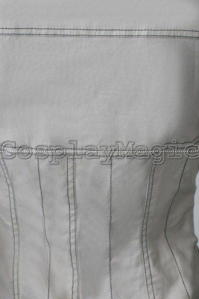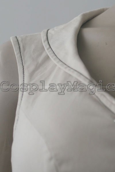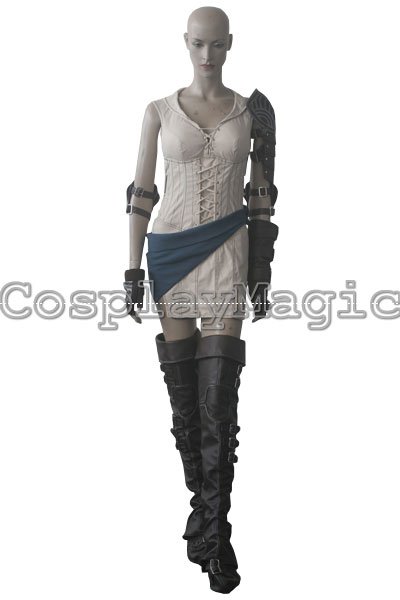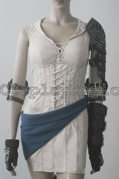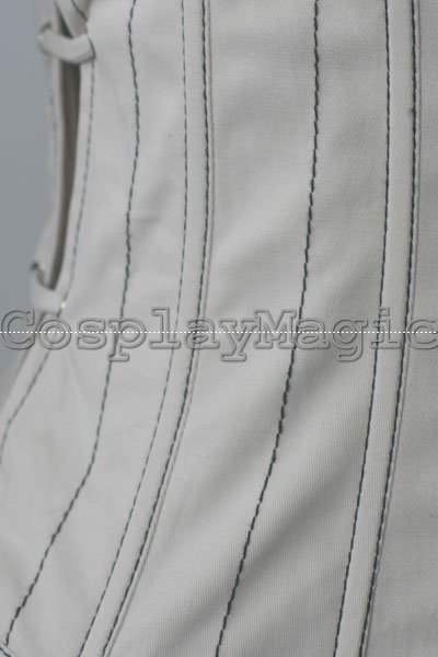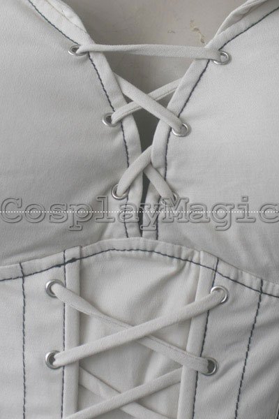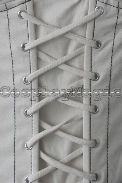 - Beige sleeveless corset dress, navy blue sash around the waist