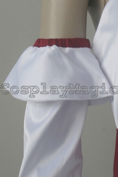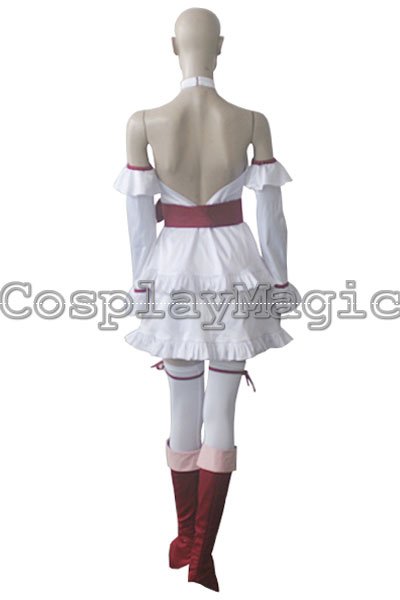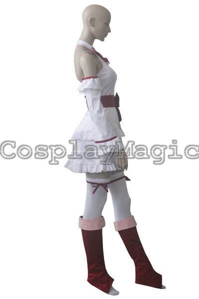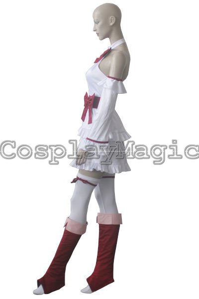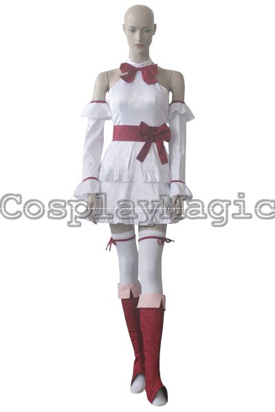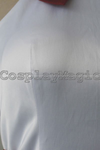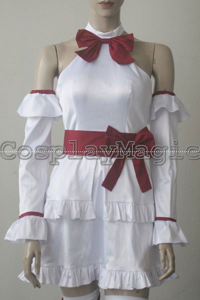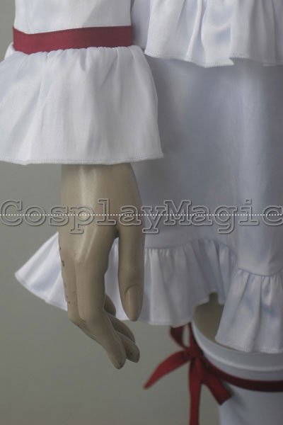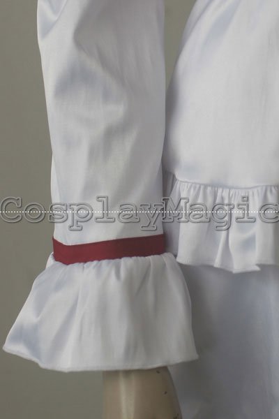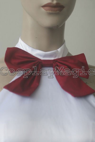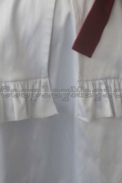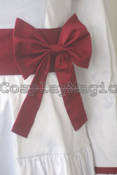 - White dress with red bows on collar and belt, frills around sleeves and bottom hem