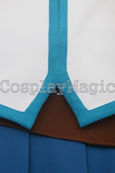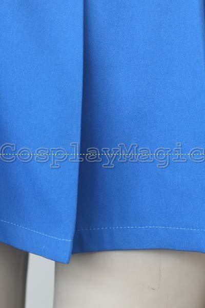 - Blue pleated skirt with a brown belt