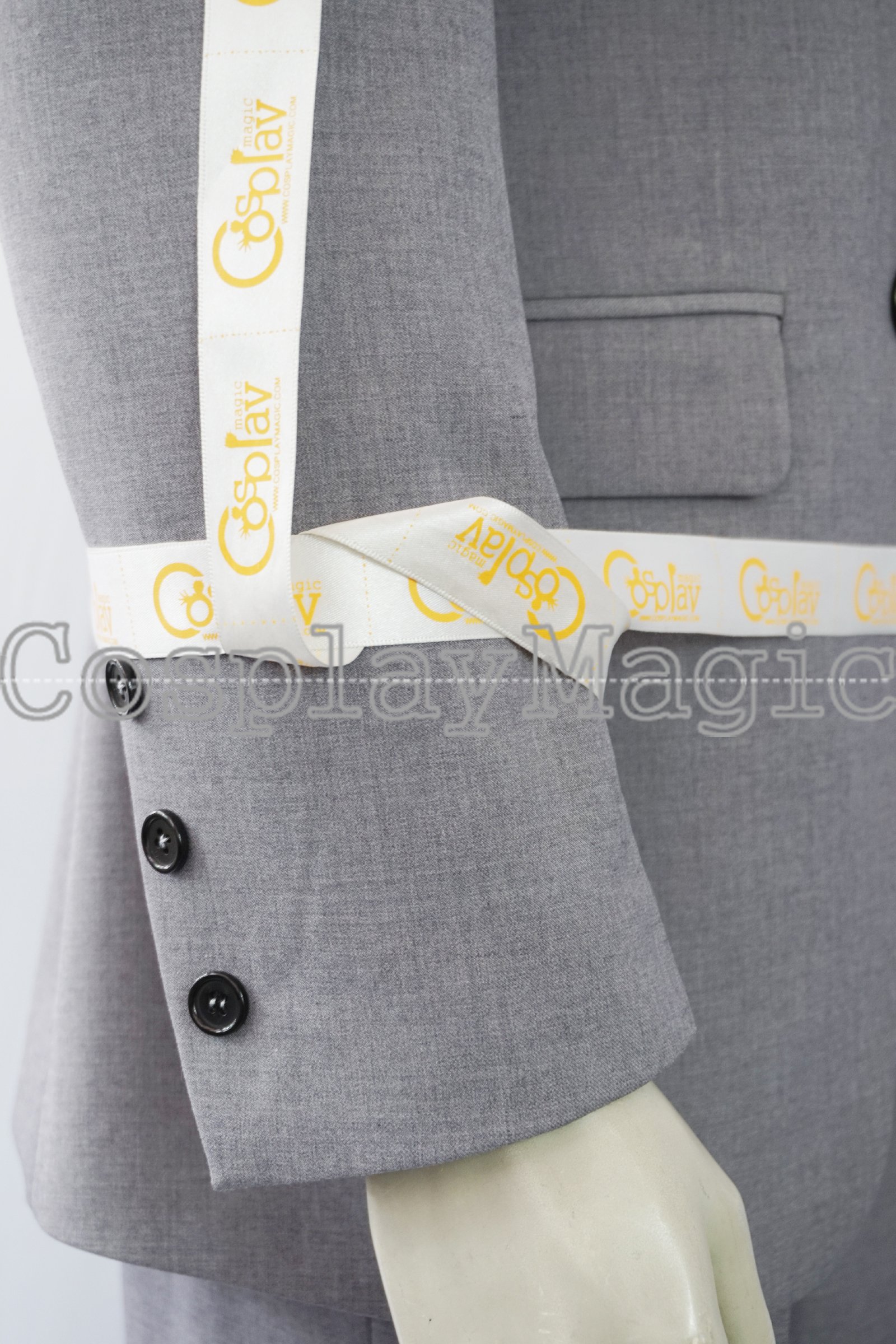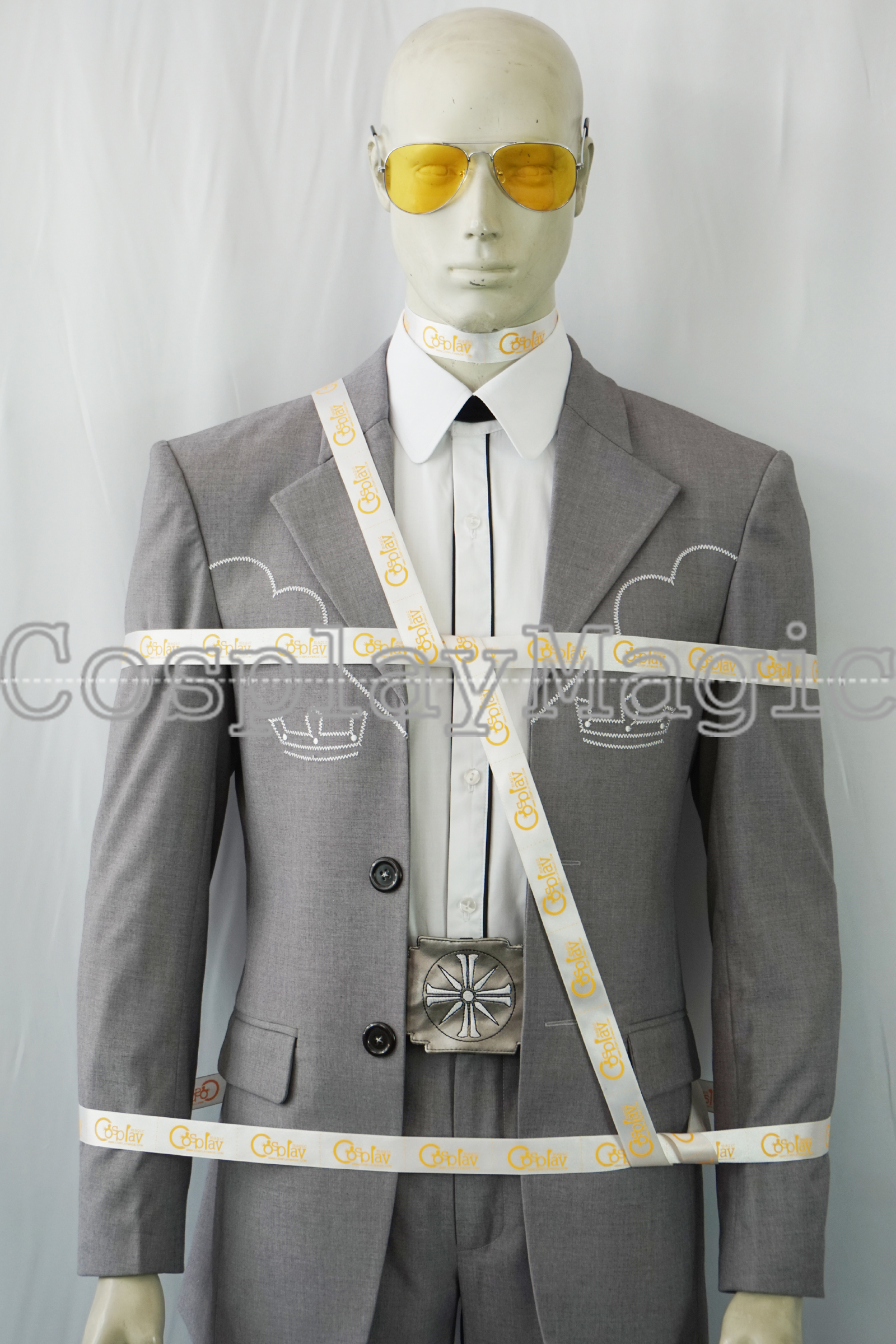 - Matched gray trousers with belt