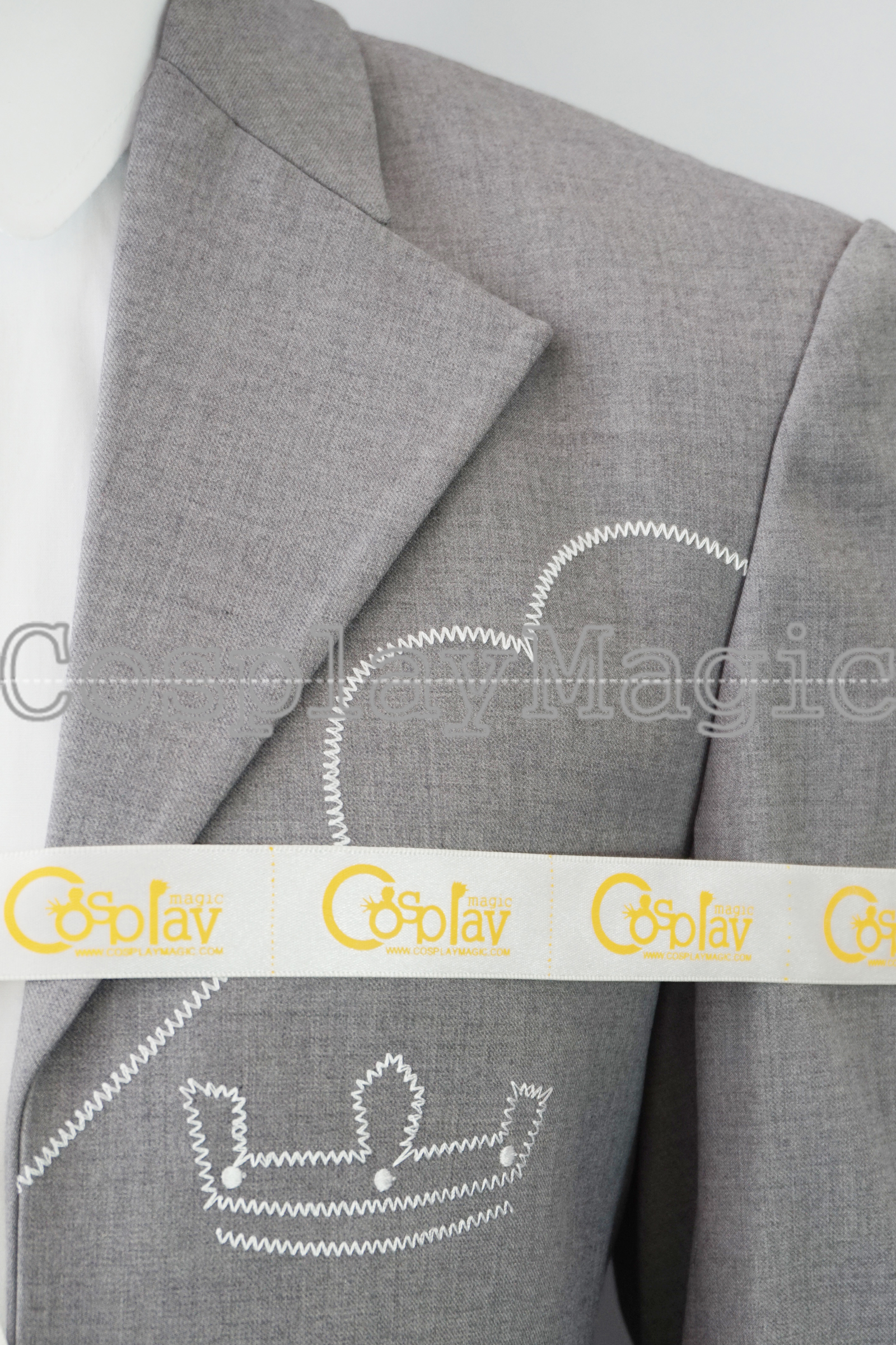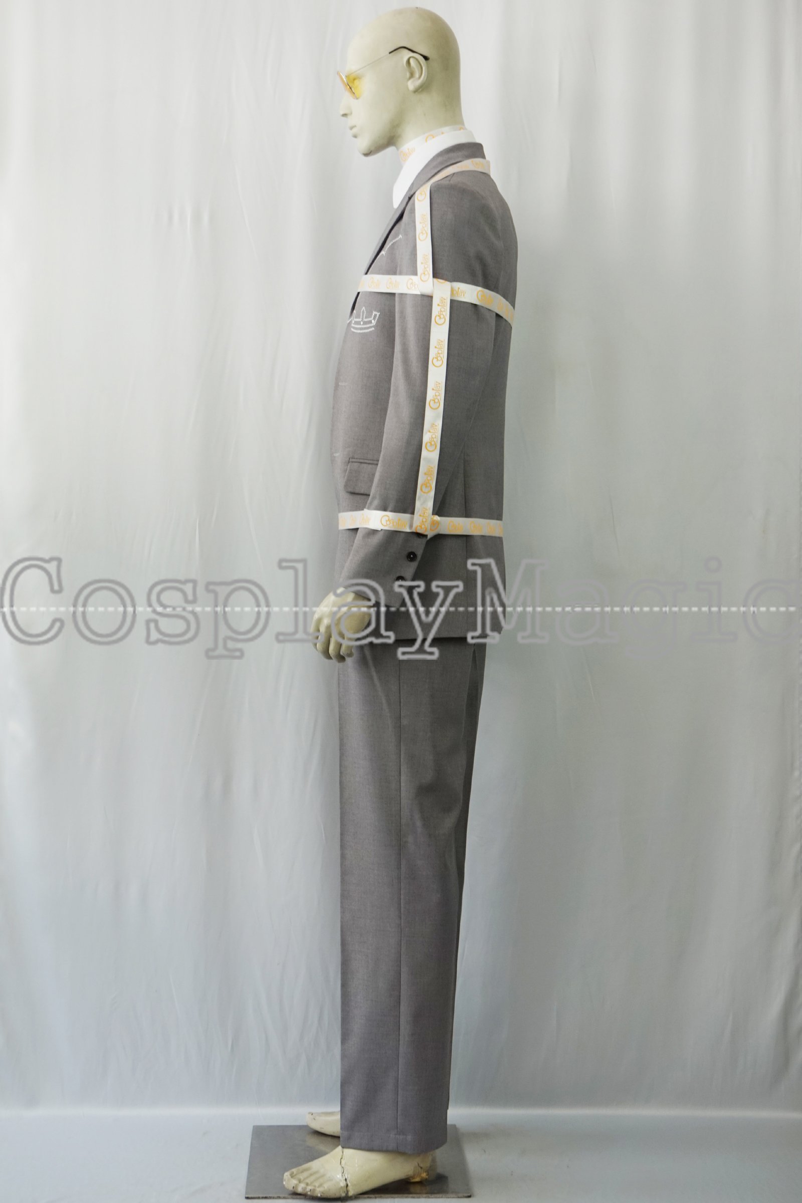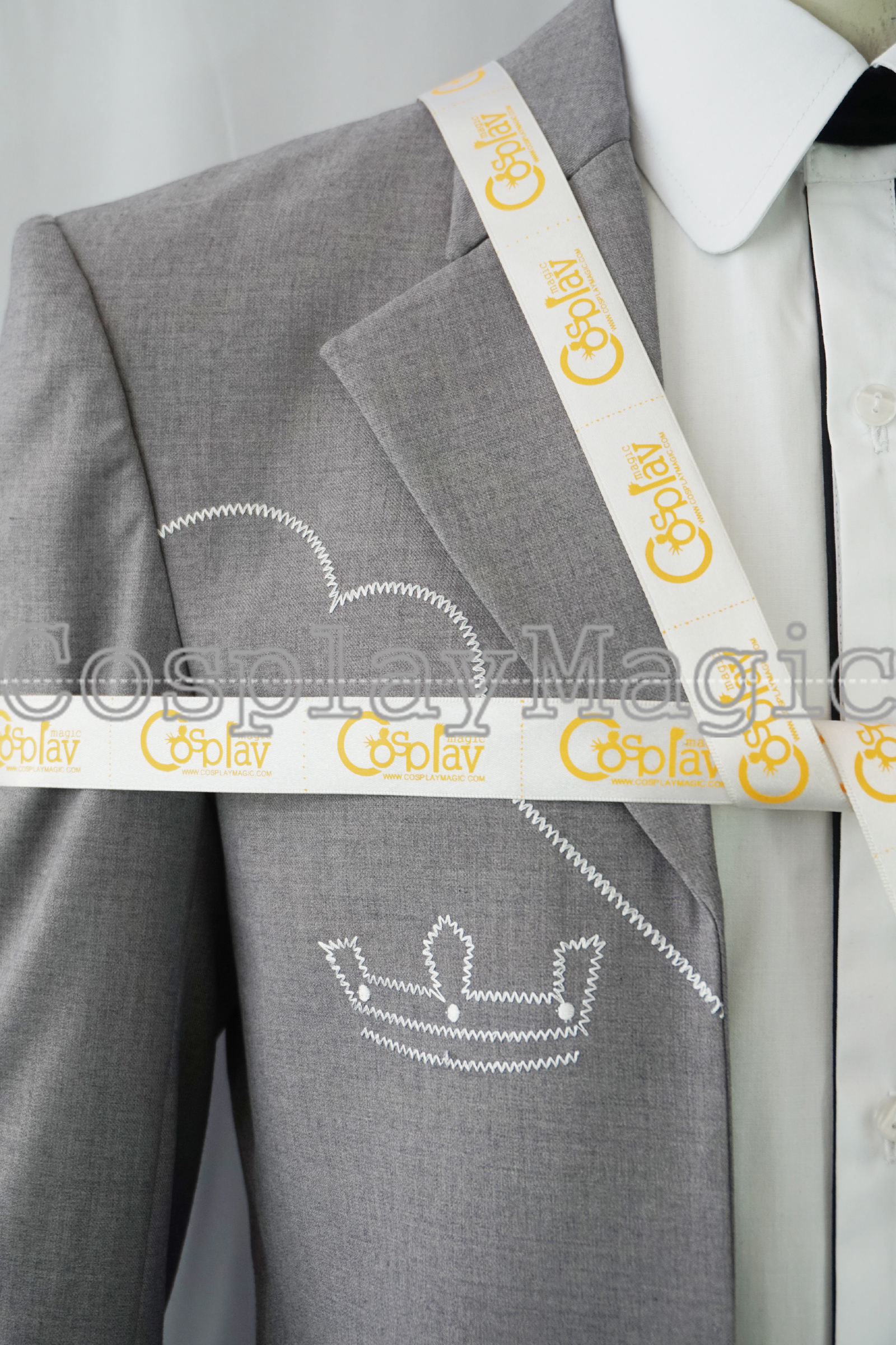 - Gray suit with white shirt underneath