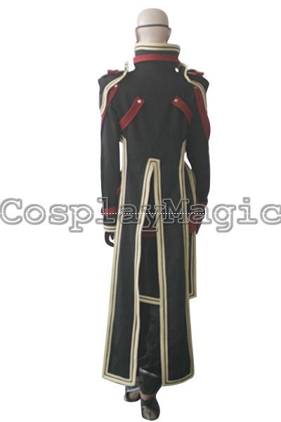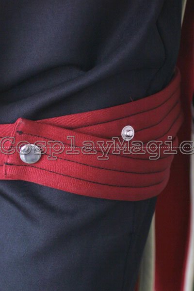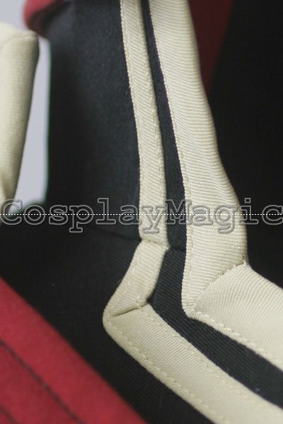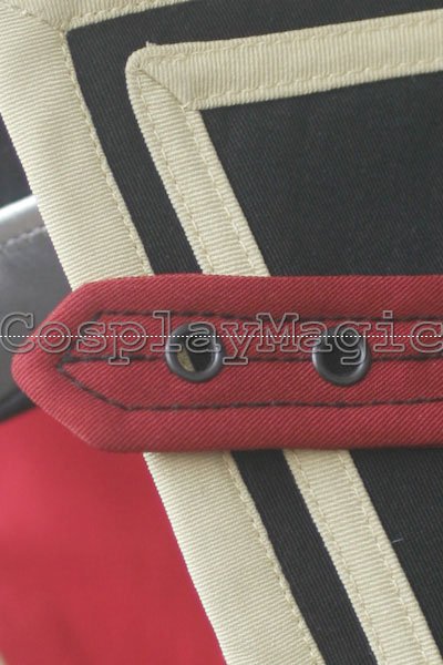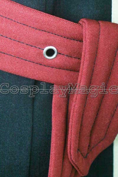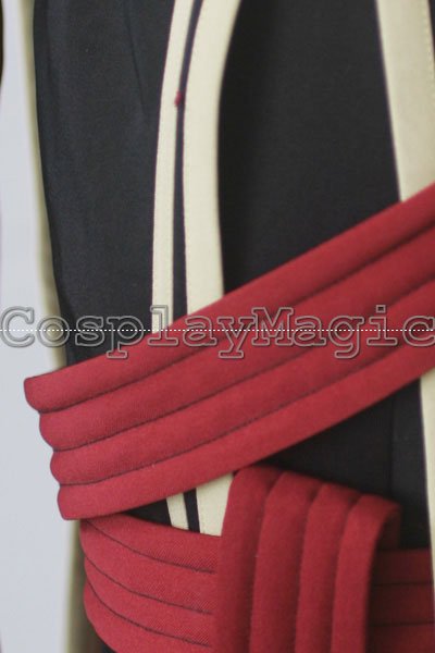 - Black high-collared coat with light-yellow edges, red stripes cross the chest