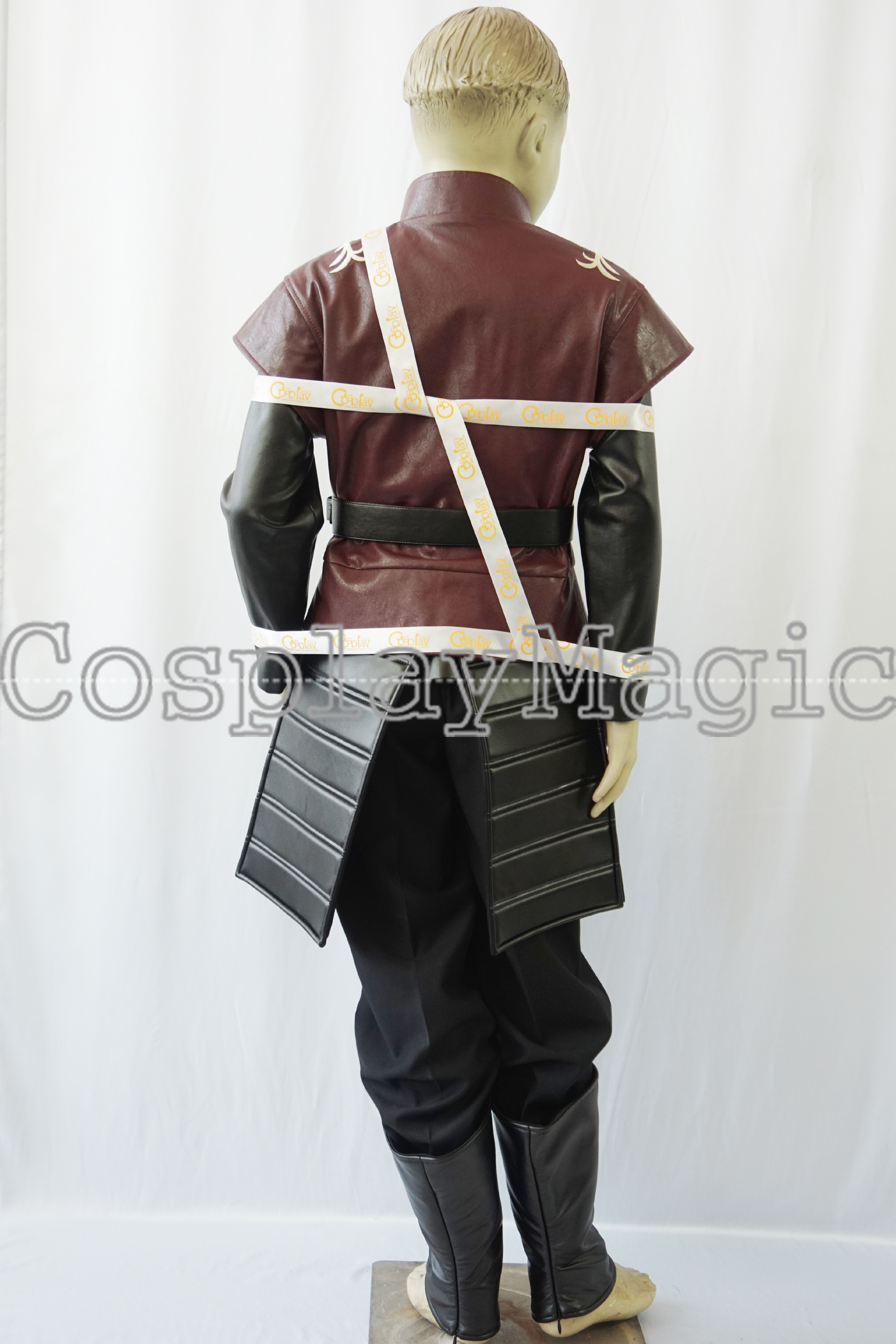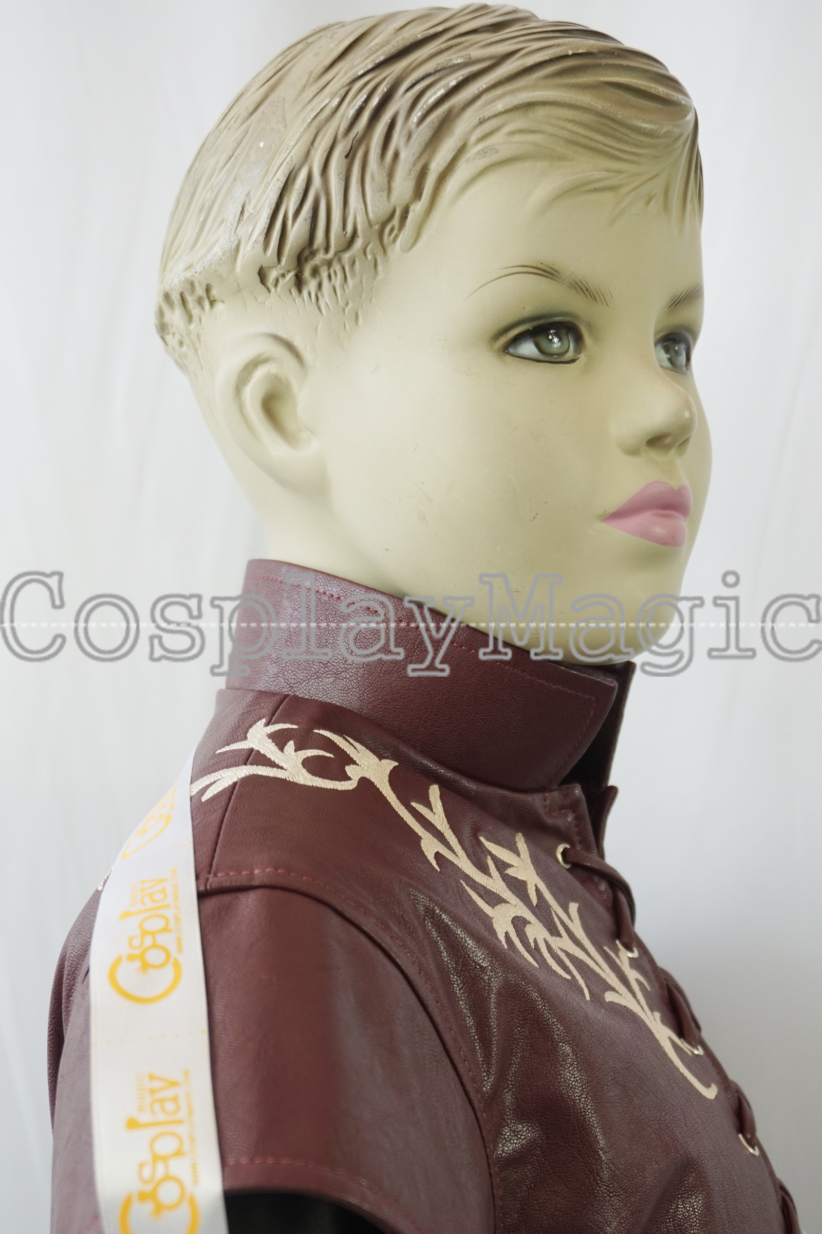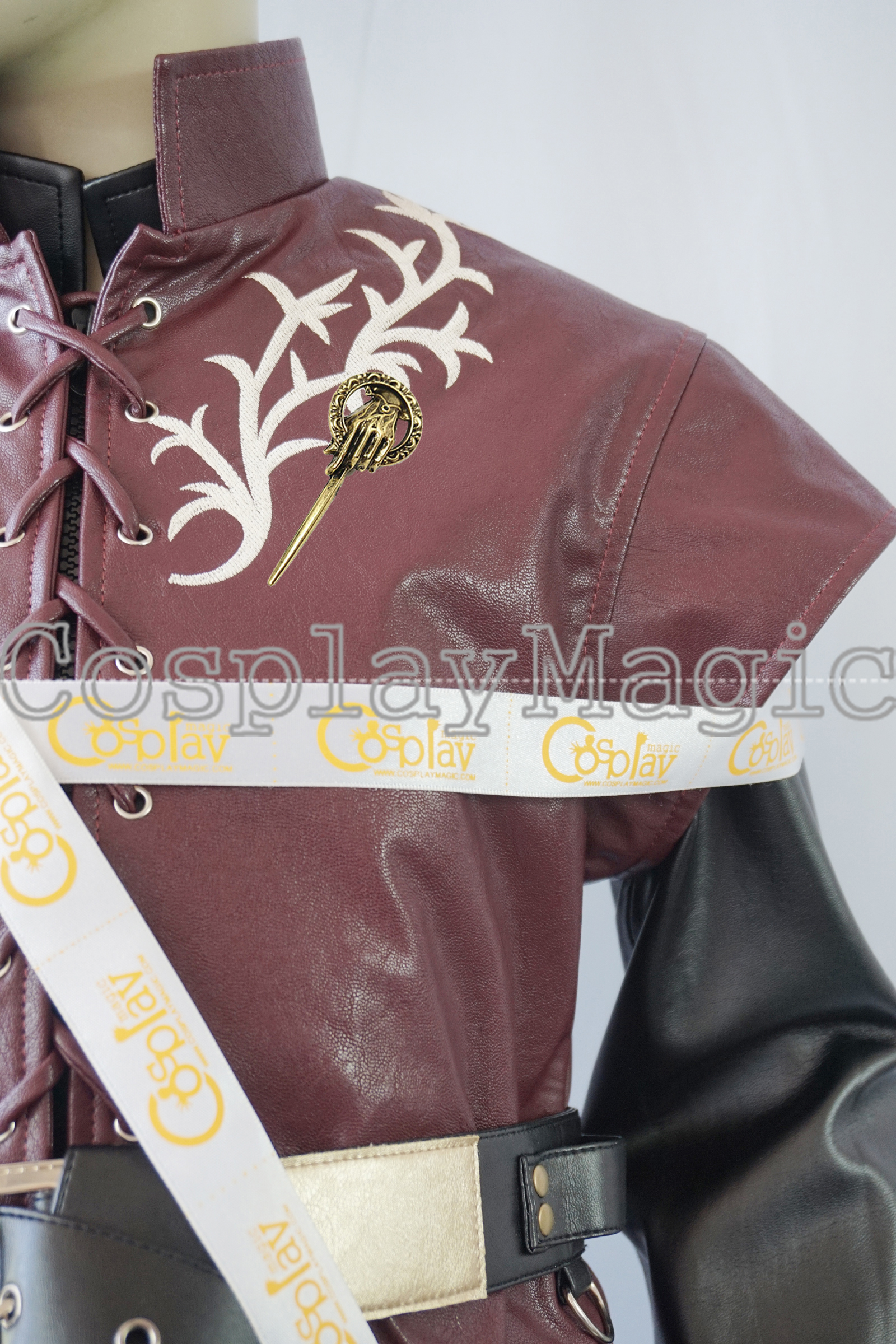 - Maroon faux leather short-sleeved jacket with The Hand of the King’s brooch