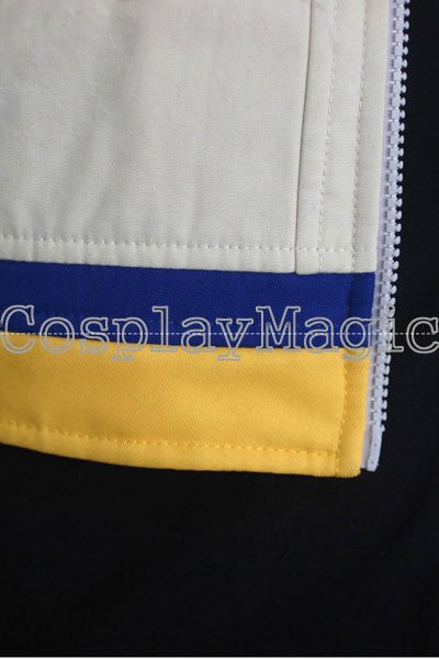 - Beige sleeveless vest with blue stripe and yellow lining
