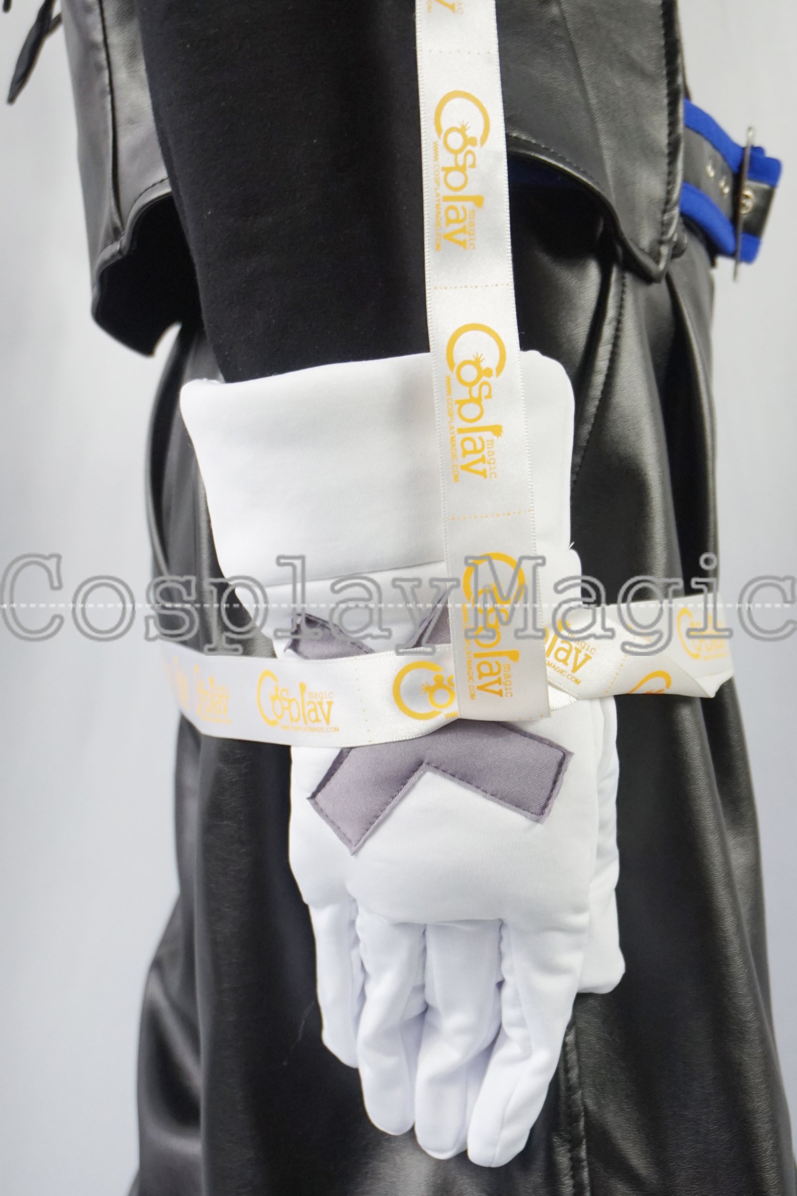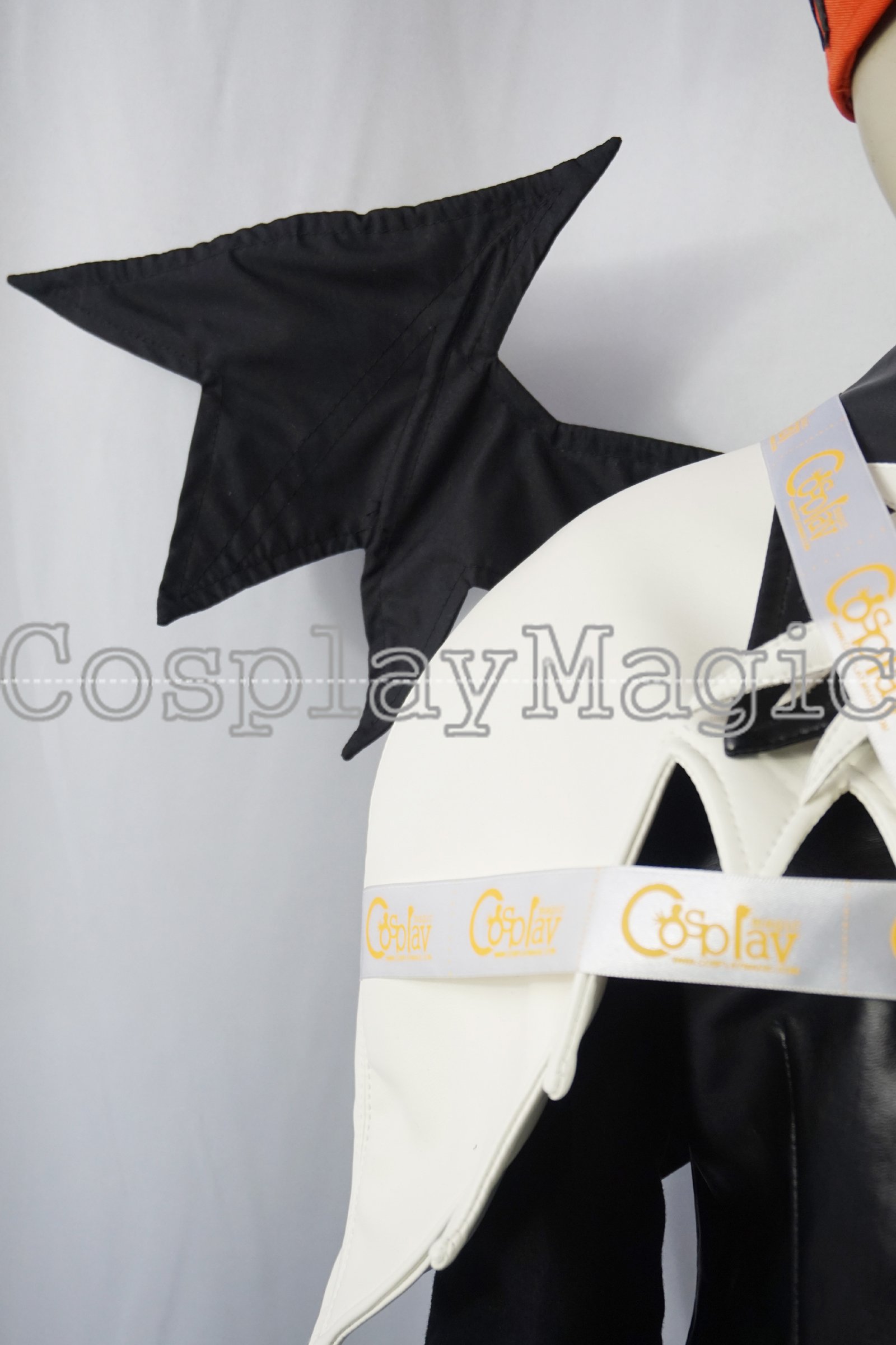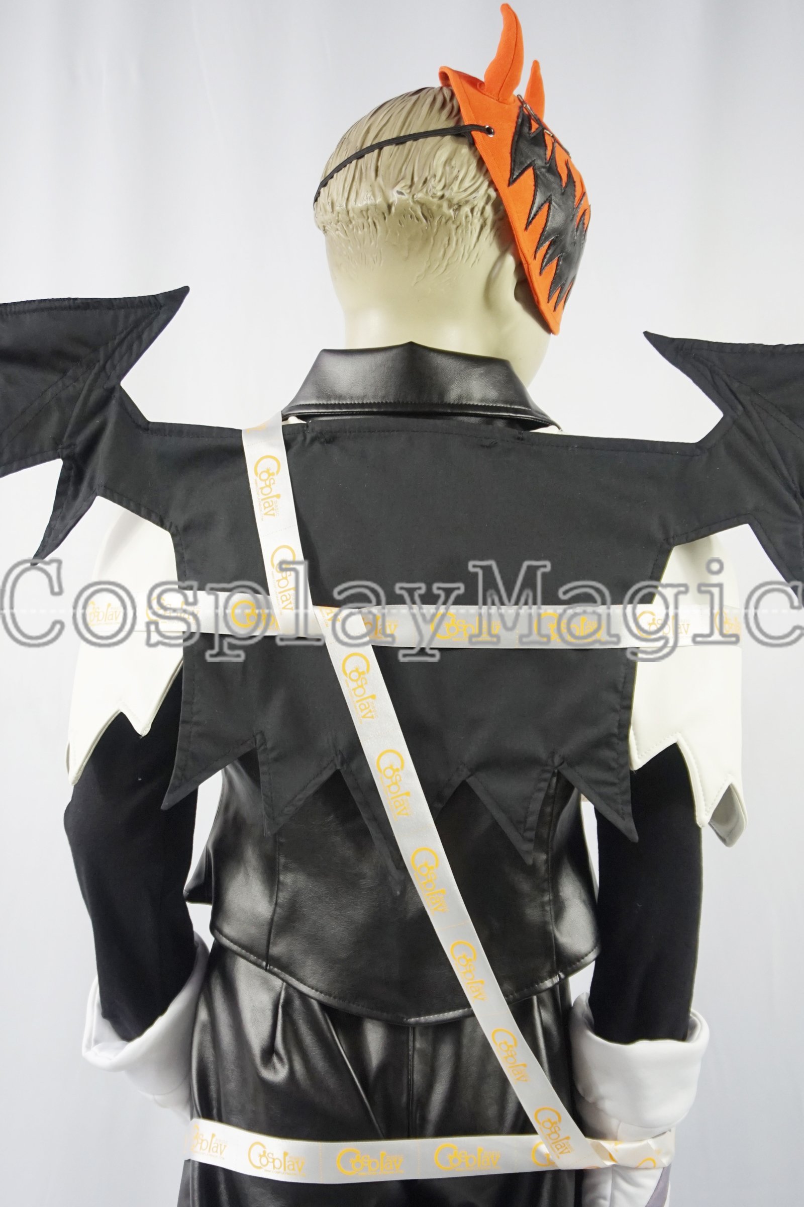 - Black faux leather jacket with white shoulders, black bat wings on the back