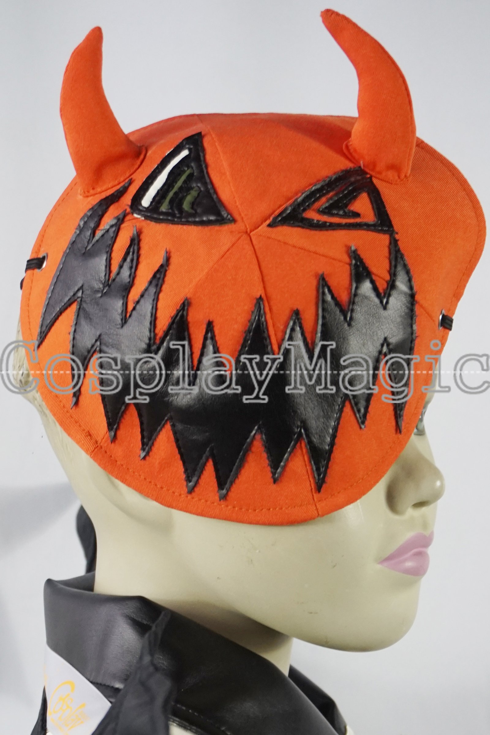 - Orange mask with small horns, triangular eyes and jack o’ lantern-esque mouth