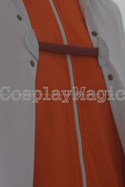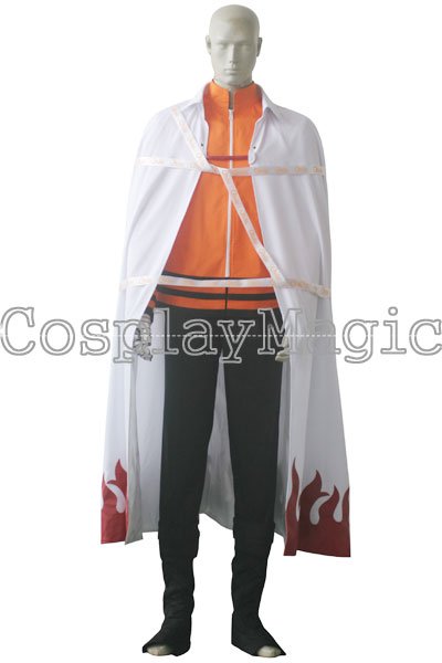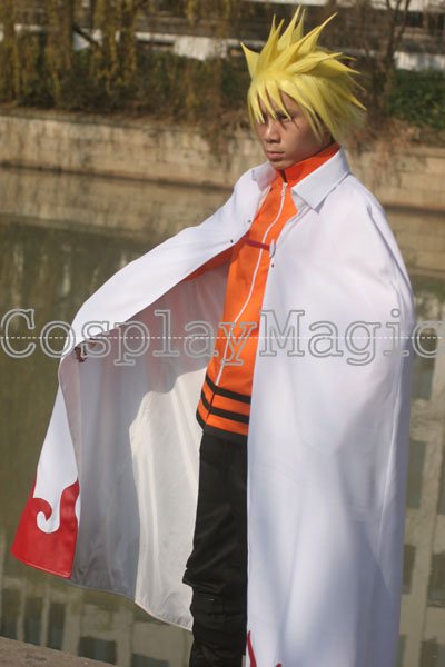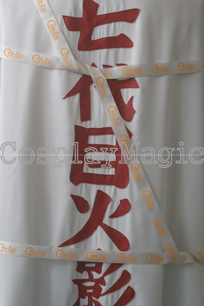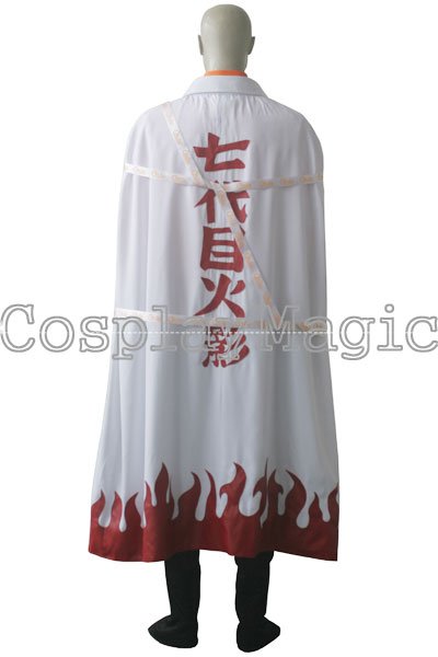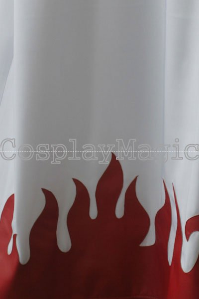 - White cloak with red faux leather flames-like motifs on the edges, and kanji for “Seventh Hokage” on the back