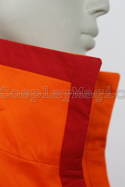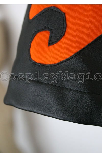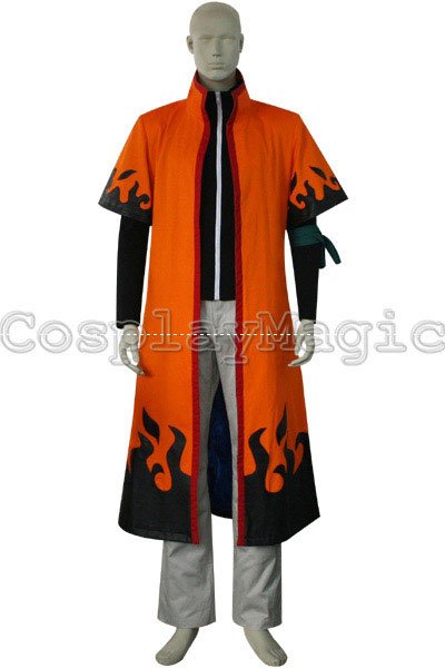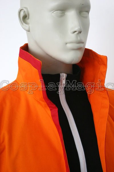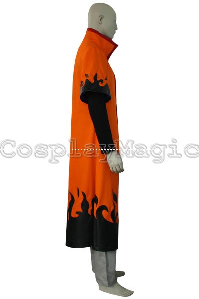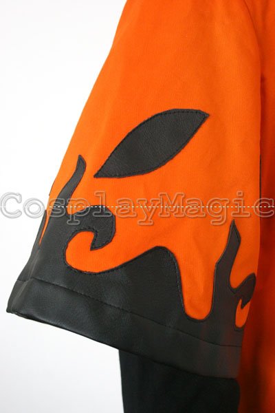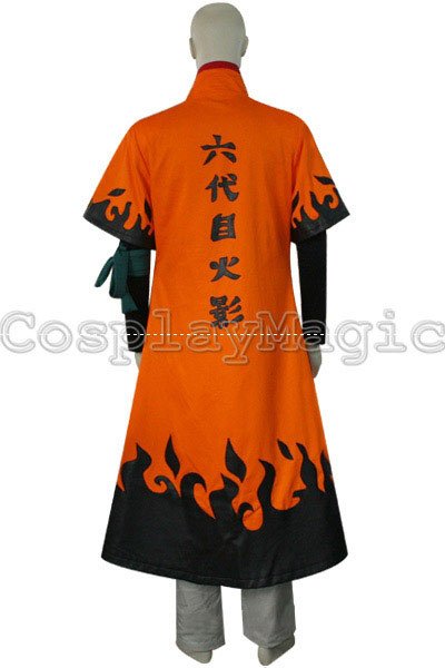 - Orange short-sleeved coat with black faux leather flame pattern along the hemline and sleeves, and kanji for “Sixth Hokage” on the back