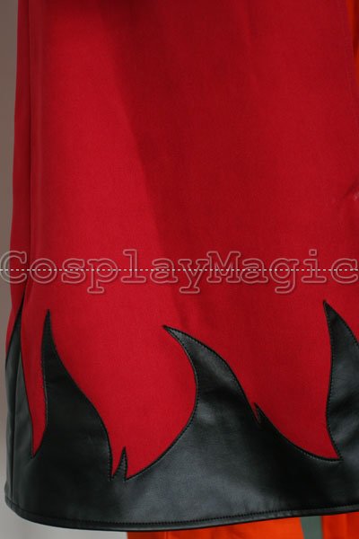 - Red short-sleeved coat with black faux leather flame pattern along the hemline