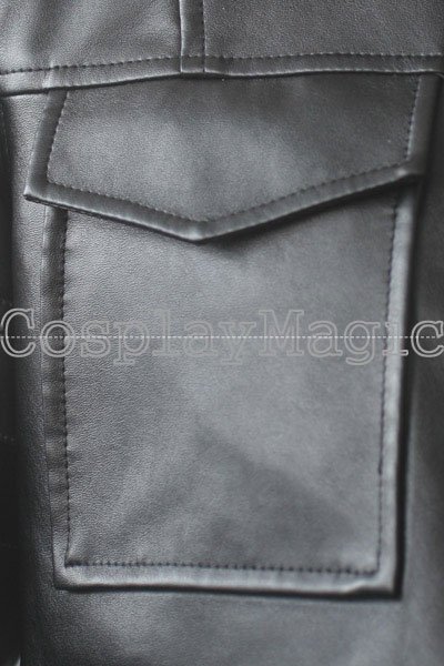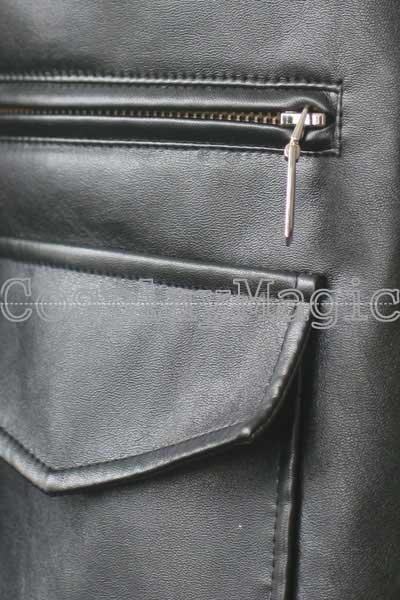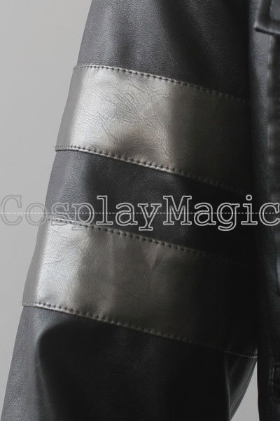 - Black faux leather jacket with bands on the arms