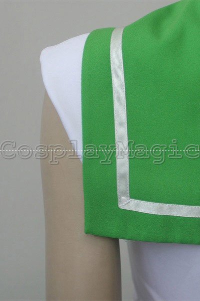- White sleeveless dress with green sailor-style collar and pleated mini skirt, pink bow-knots in the front and on the back