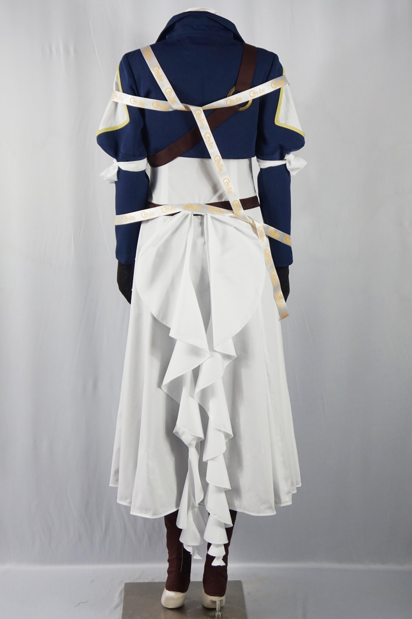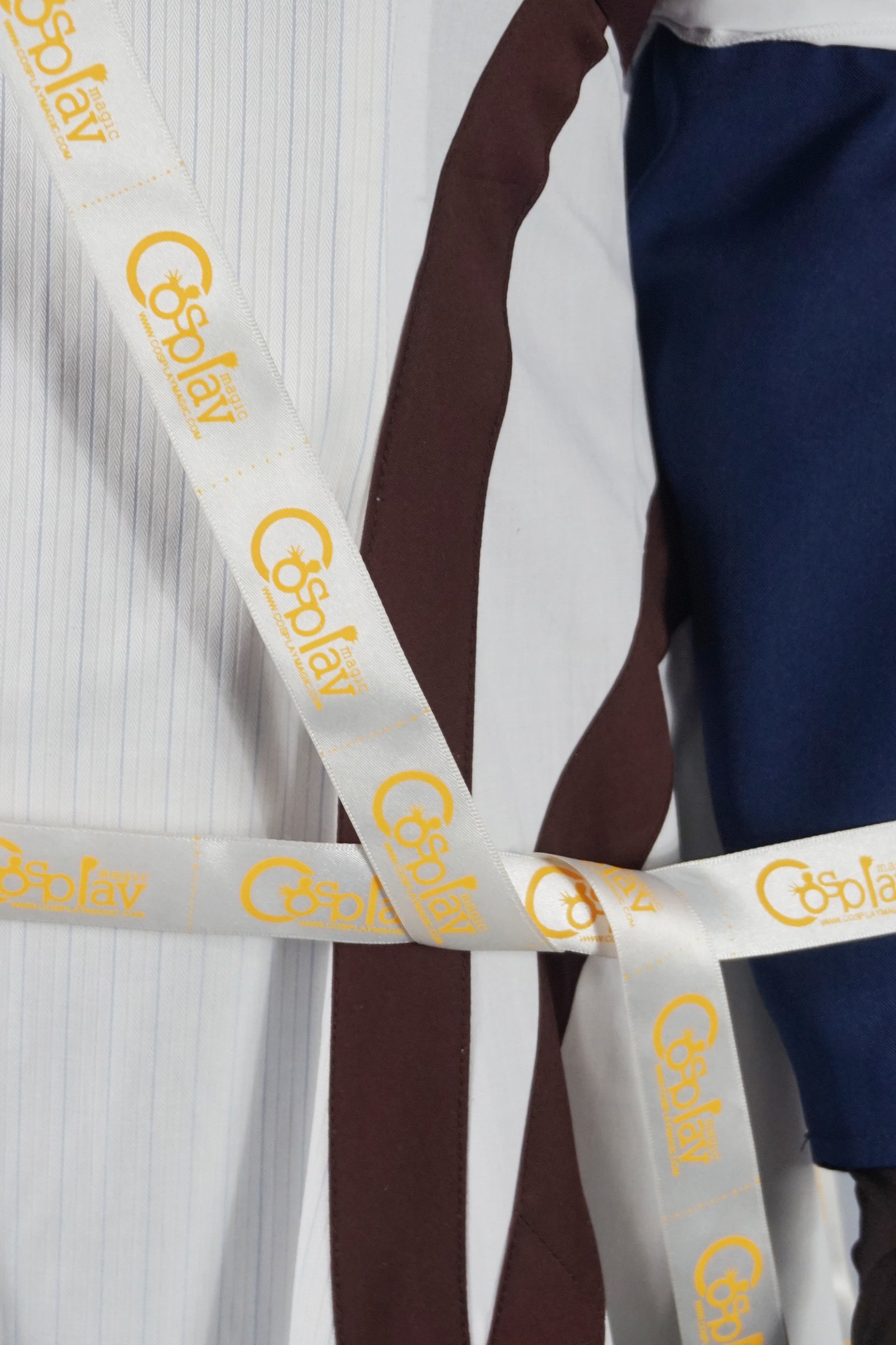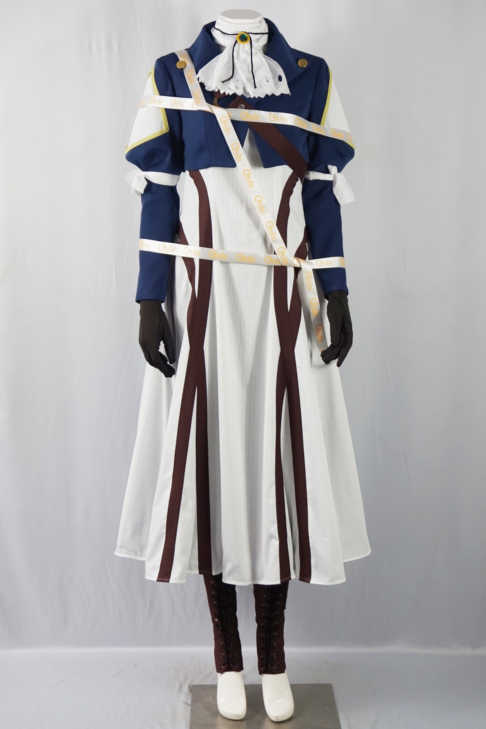 - Blue long-sleeved jacket with white ribbon-tie dress underneath