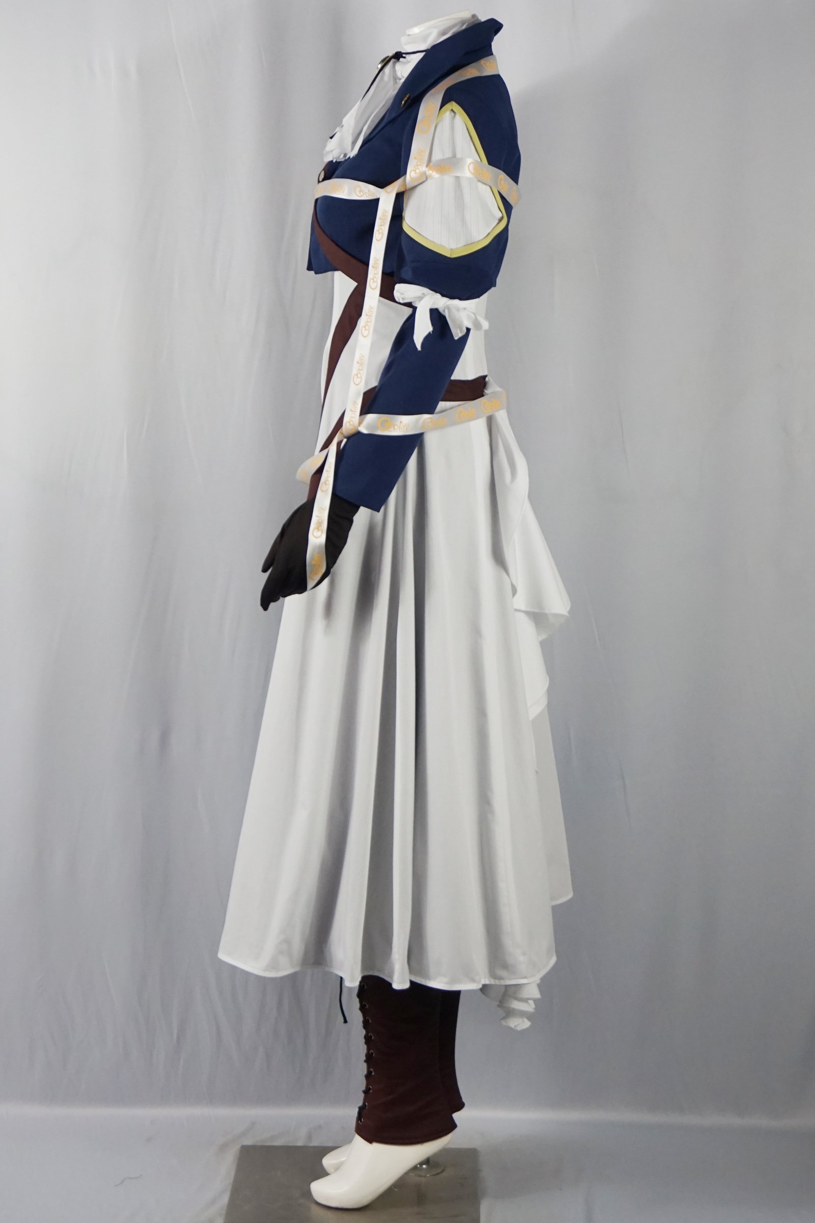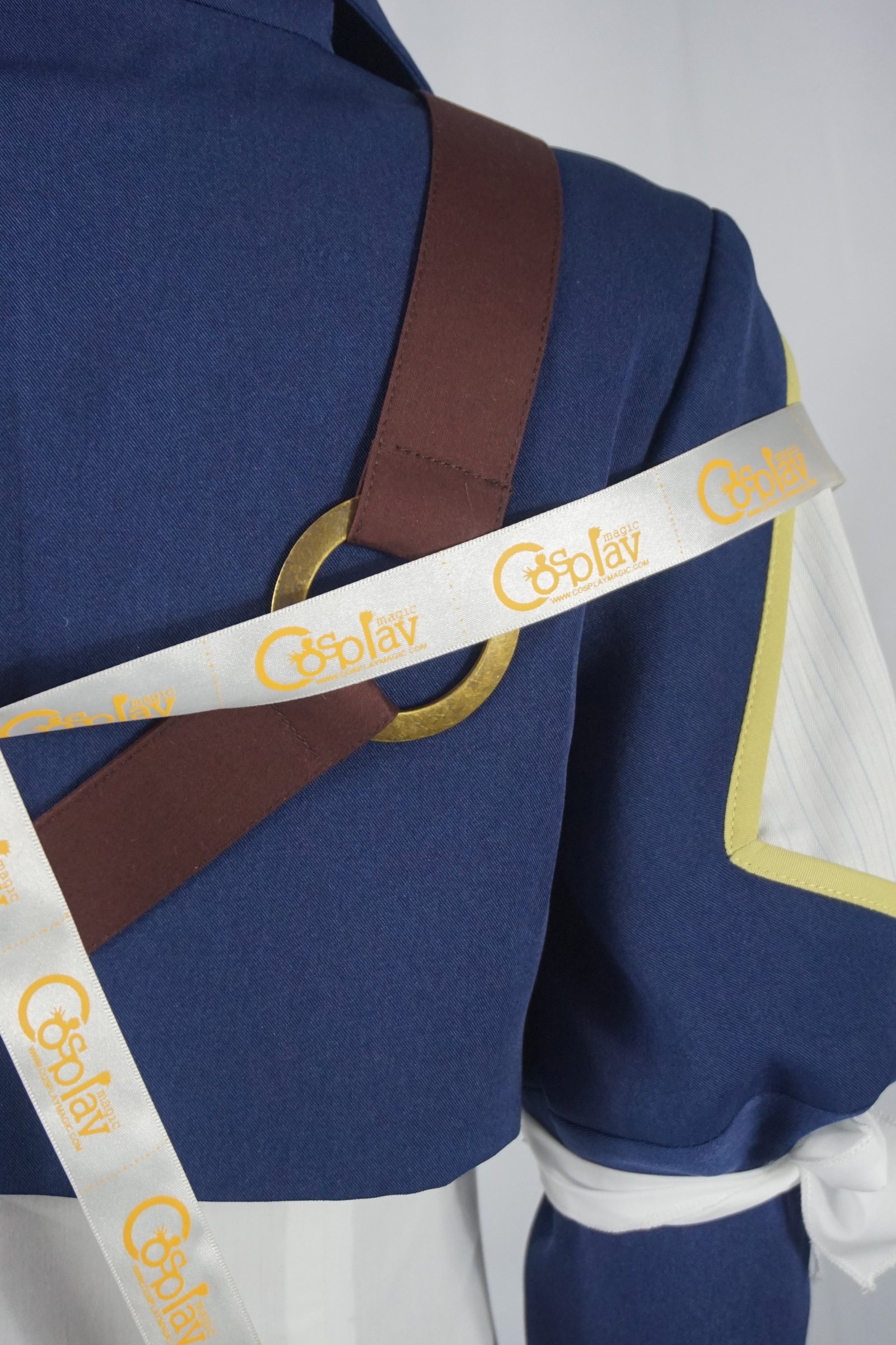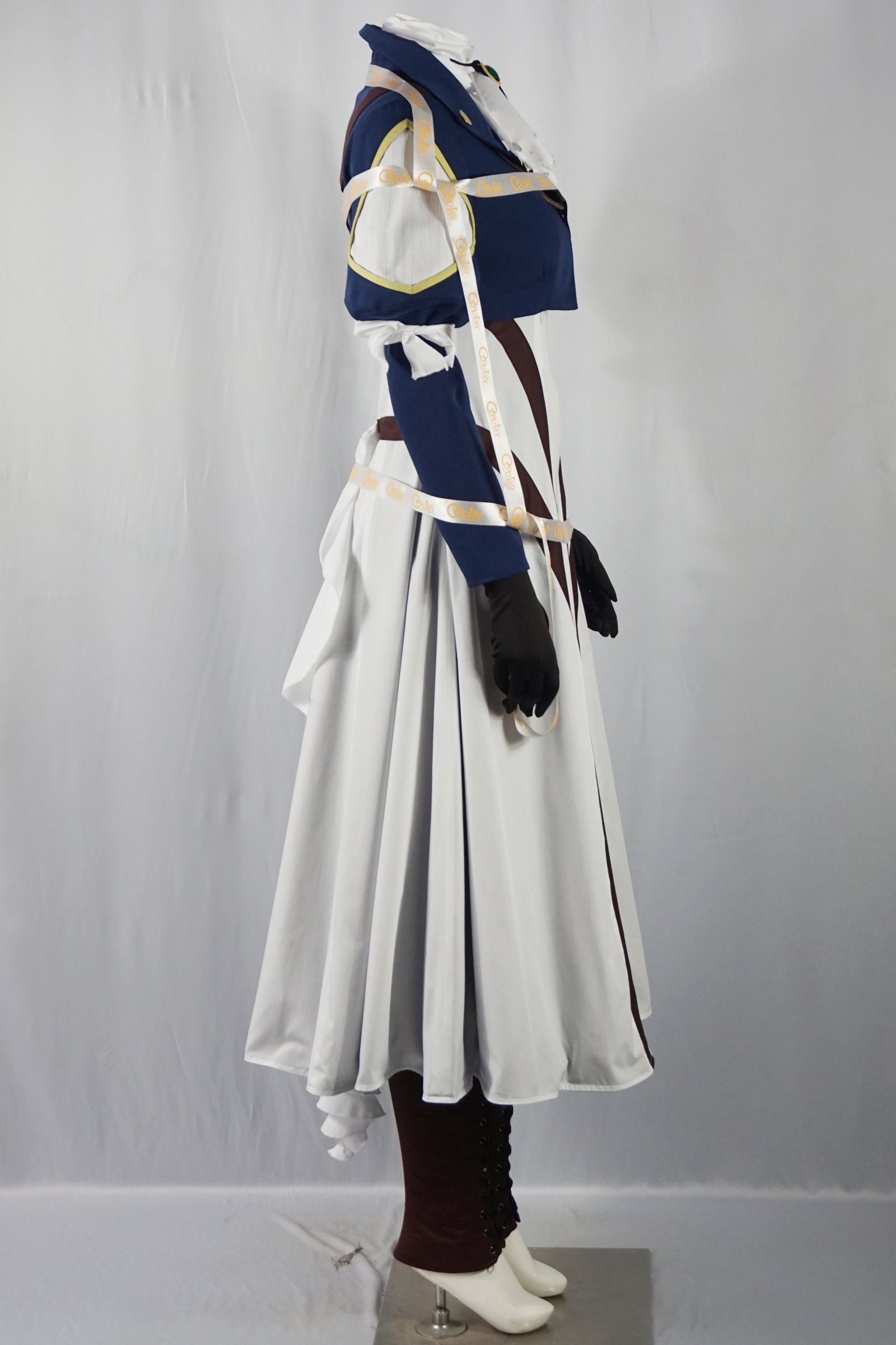 - Blue long-sleeved jacket with white ribbon-tie dress underneath